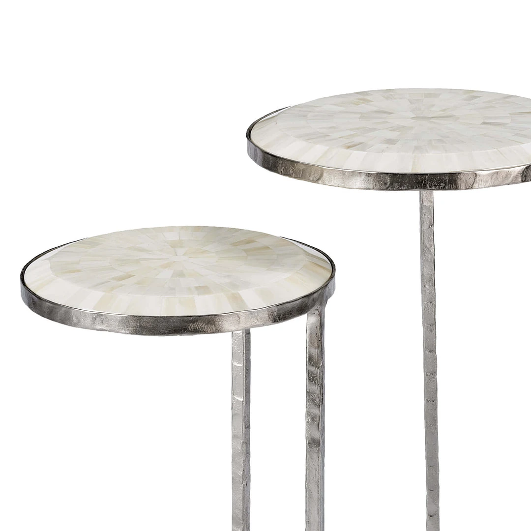 Fragments of bone are shaped into tiles and inlaid by hand to create the rich mosaic tops of our tables. Buffed to a high-gloss shine, their warm natural hues are set off by airy frames in polished nickel. When not holding cappuccino and truffles, the set of two nests compactly.