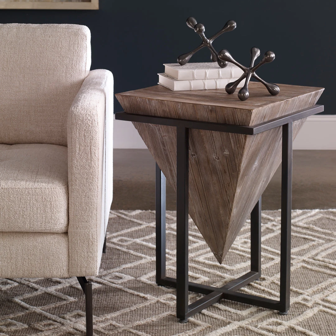 This Upside Down Pyramid Constructed From Aged Fir Wood Is Finished In A Heavy Hand Applied Gray Wash, Nestled Into An Iron Base Finished In Aged Black.