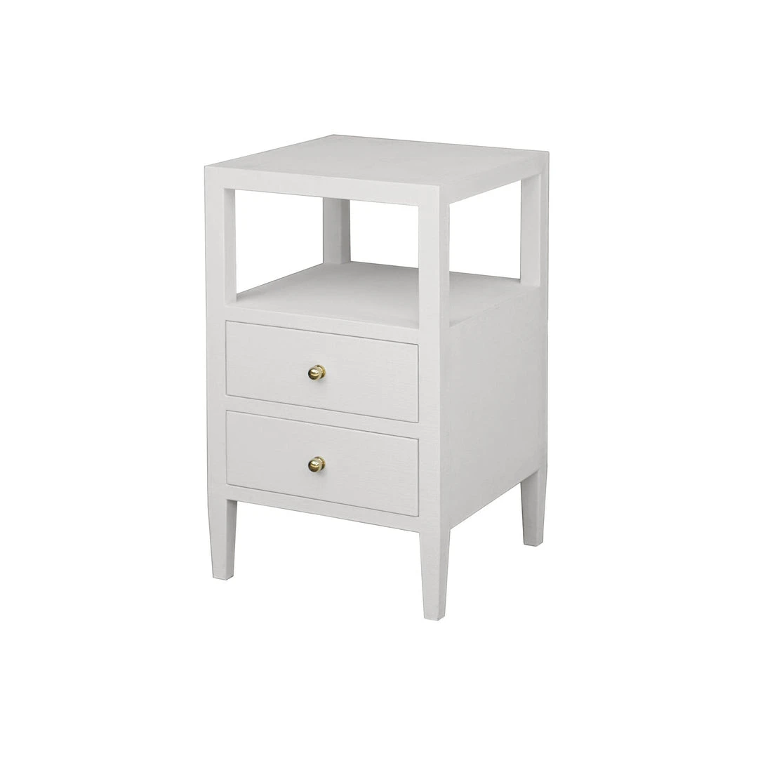 With its sophisticated form and subdued texture, the Roscoe side table brings style and elegance to any room. Two drawers with petite brass pulls sit elegantly beneath an open storage shelf. Finished in lacquered white linen, its the perfect accompaniment to your favorite chair.