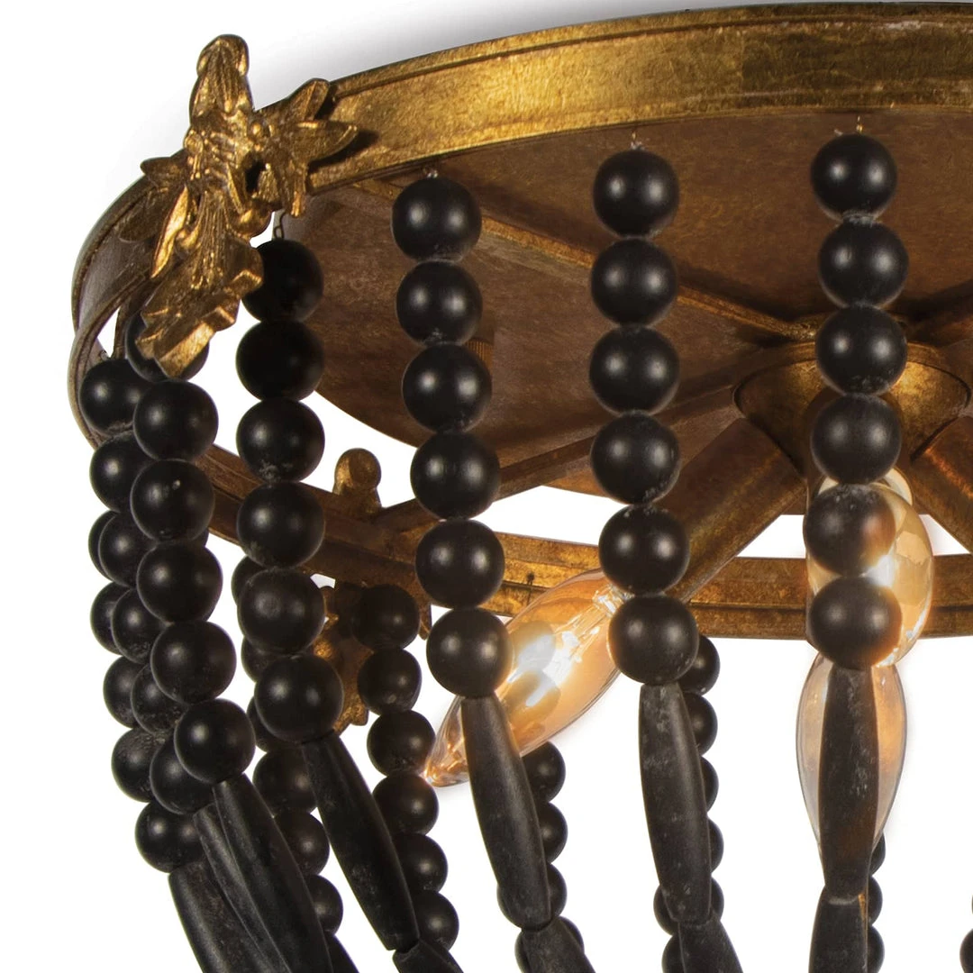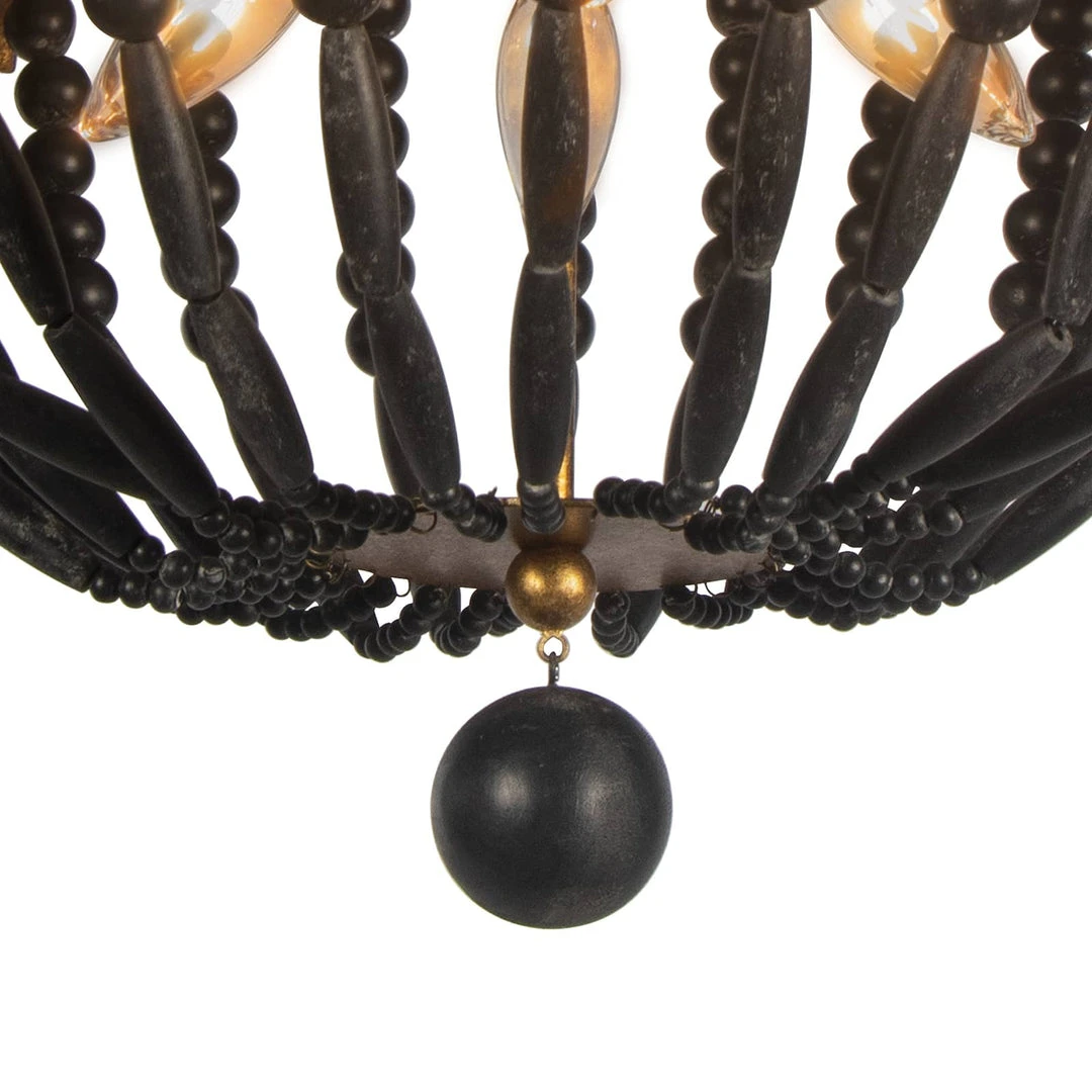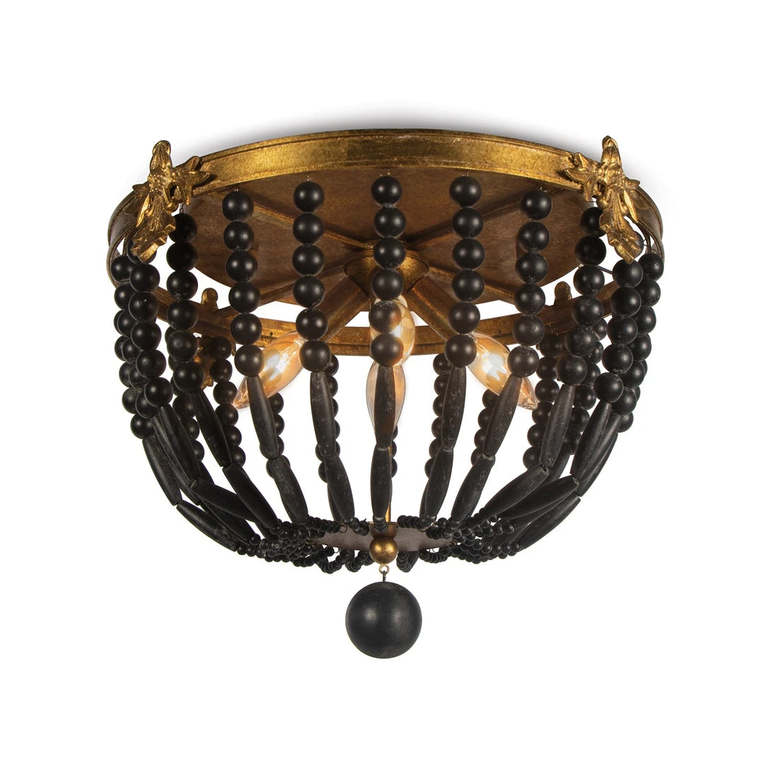 Blackened wood beads and an antique gold finish play well together in the Fabian Flush Mount. Vintage accents on Fabian’s gilded frame provide a touch of opulence. A dangling wooden spere finial balances the design. Install in a hallway, above a sink, in a bedroom or where there are low level ceilings for a casual, vintage statement.