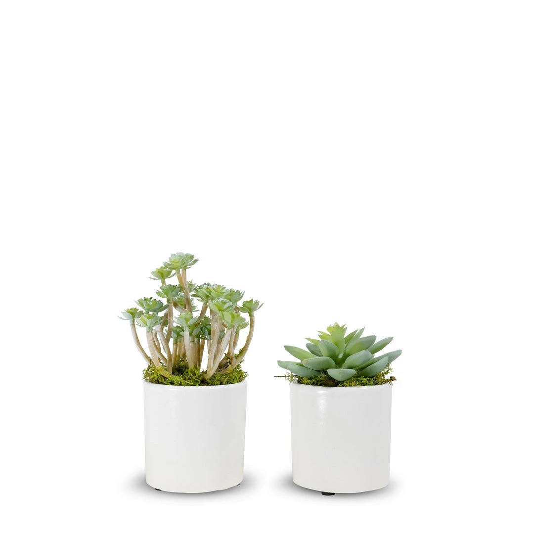 Pair Of Succulents In Small White Pots. Wipe clean with dry cloth, do not use liquid and keep out of sun.