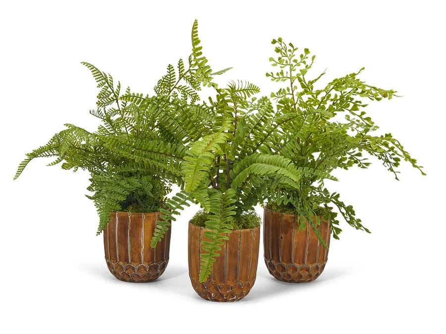 A fern pack of 3 types of greenery placed in small rustic glass containers for a more natural look.