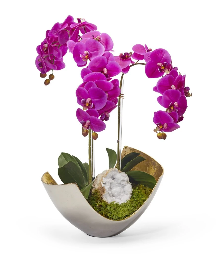 Fuchsia Phalaenopsis orchids with Moroccan geode nestled in a two tone contemporary aluminum container, finished off with preserved moss’s. While the outside is silver the inside is finished off with gold leafing