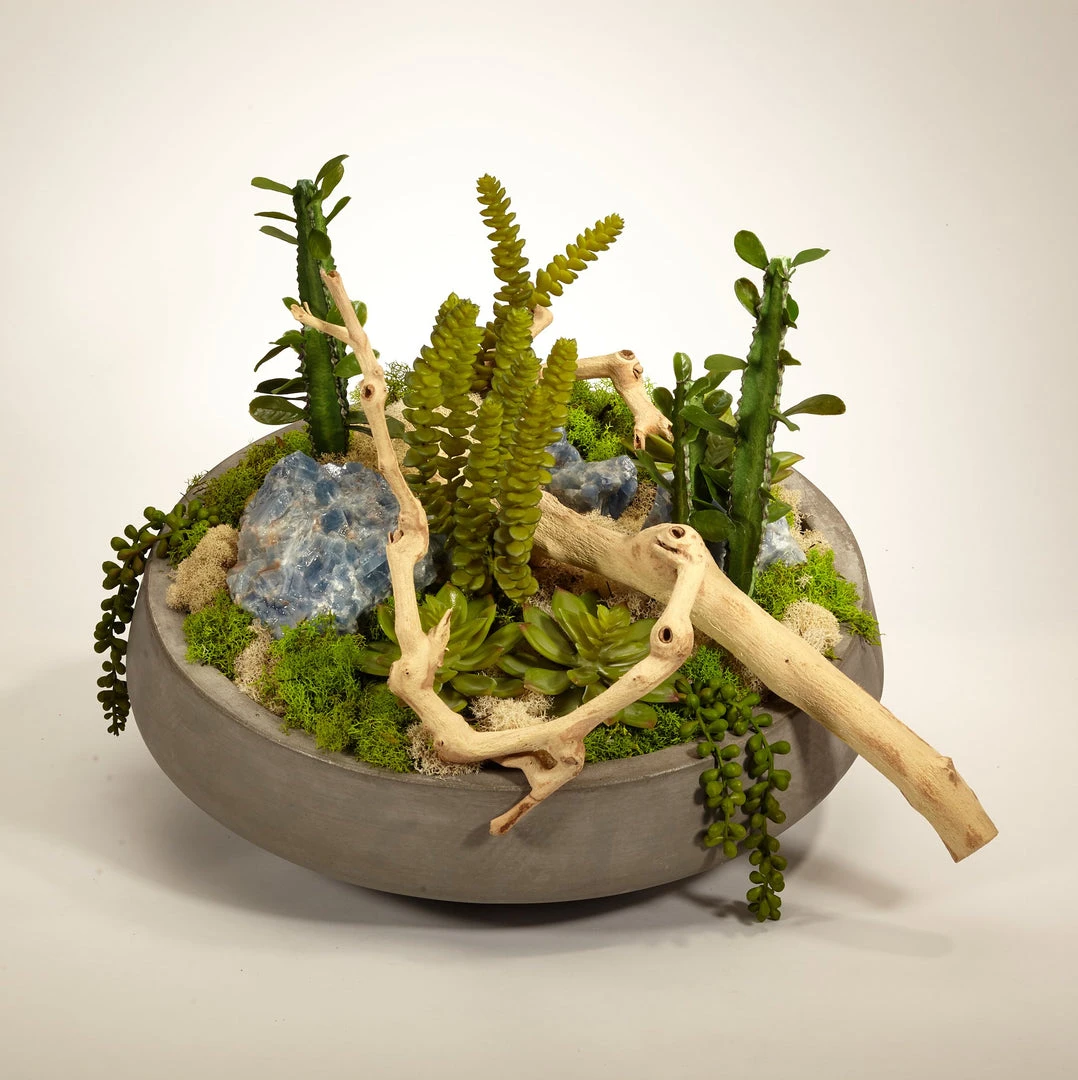 Succulents and Drift Wood in Large Concrete Bowl.