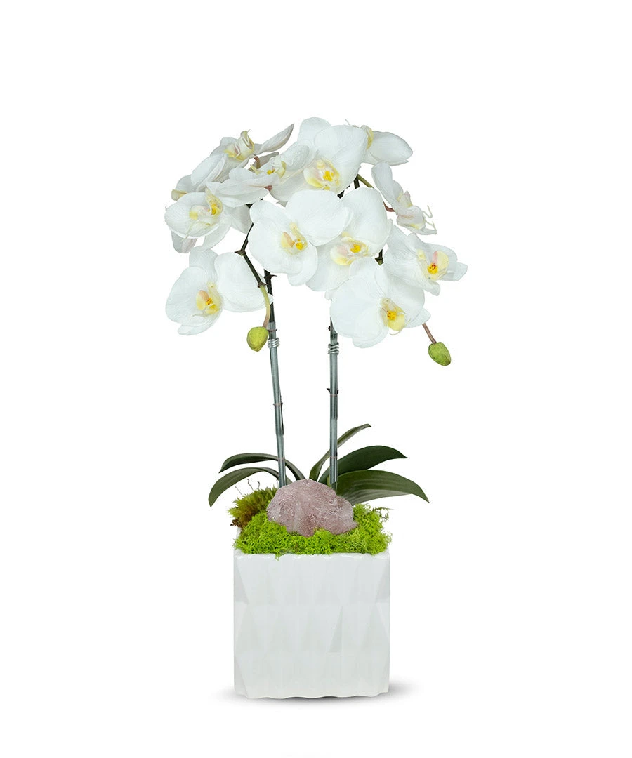 Double Orchid In White Ceramic Container. Wipe clean with dry cloth, do not use liquid and keep out of sun.