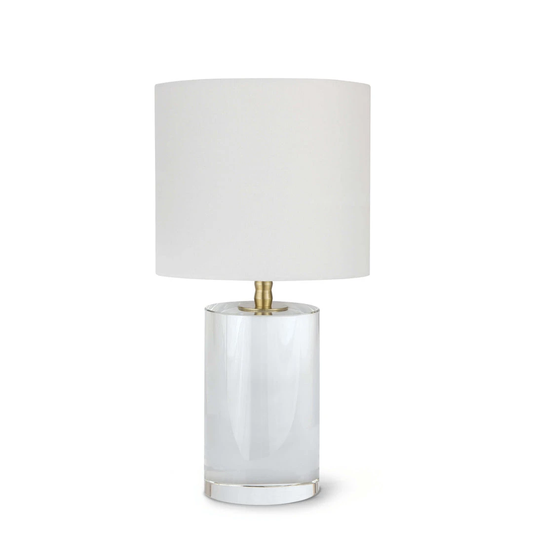 Stunning and elegant, the Juliet Table Lamp is crafted of optical crystal, fitted with natural brass hardware and topped with a natural linen drum shade. This clear and sculptural lamp lends itself to a variety of settings, making it a versatile option for the living or bedroom, or in pairs atop side tables flanked on each side of a sofa.