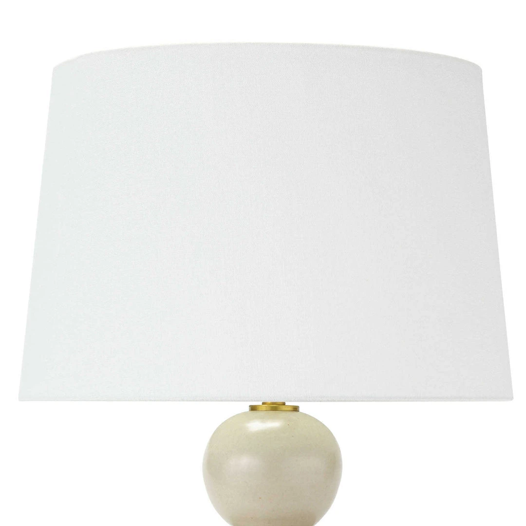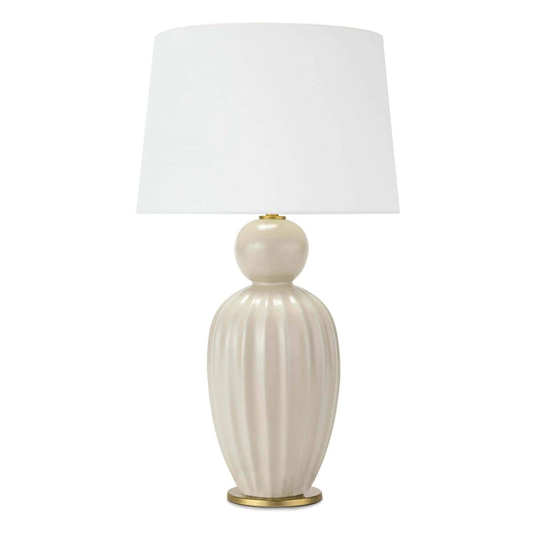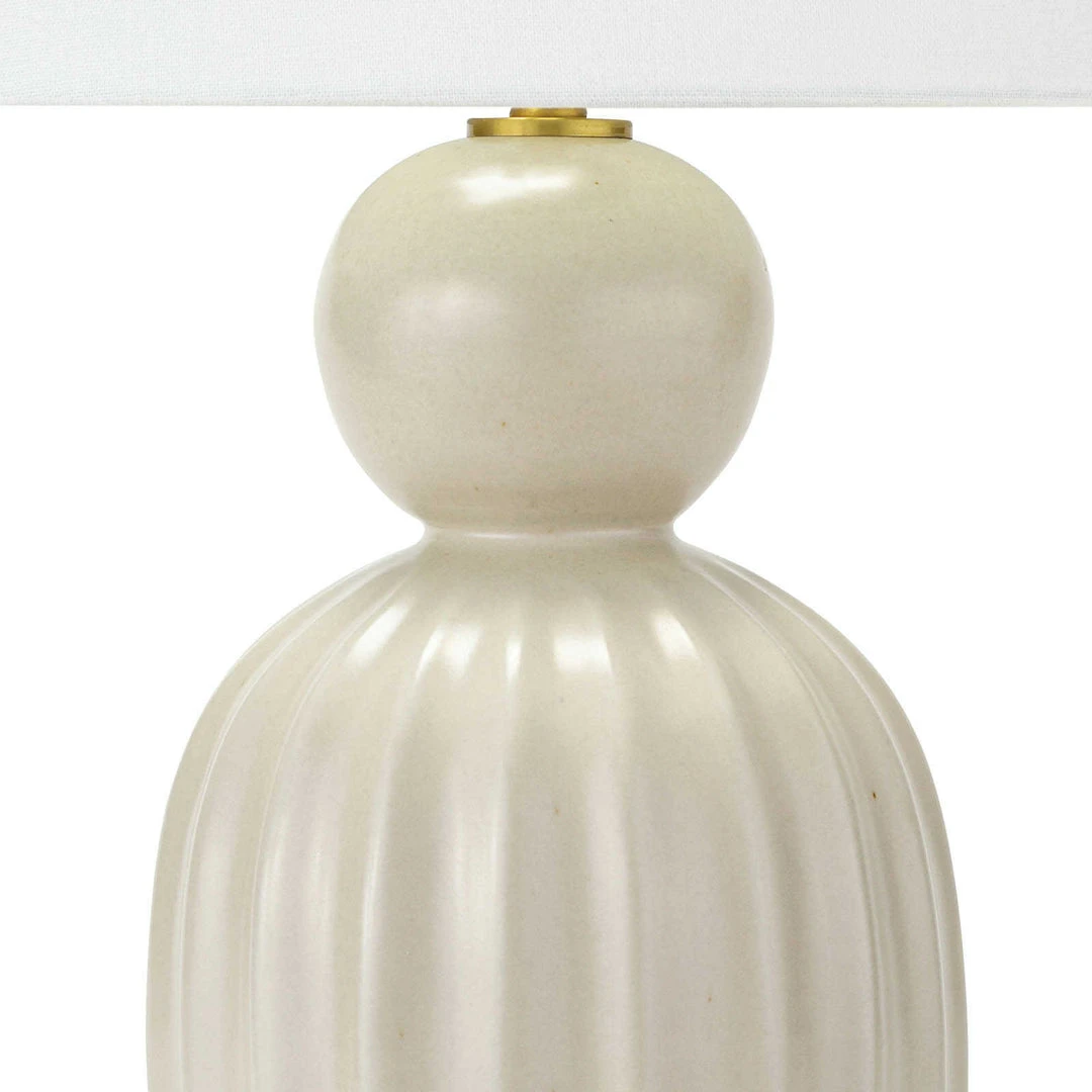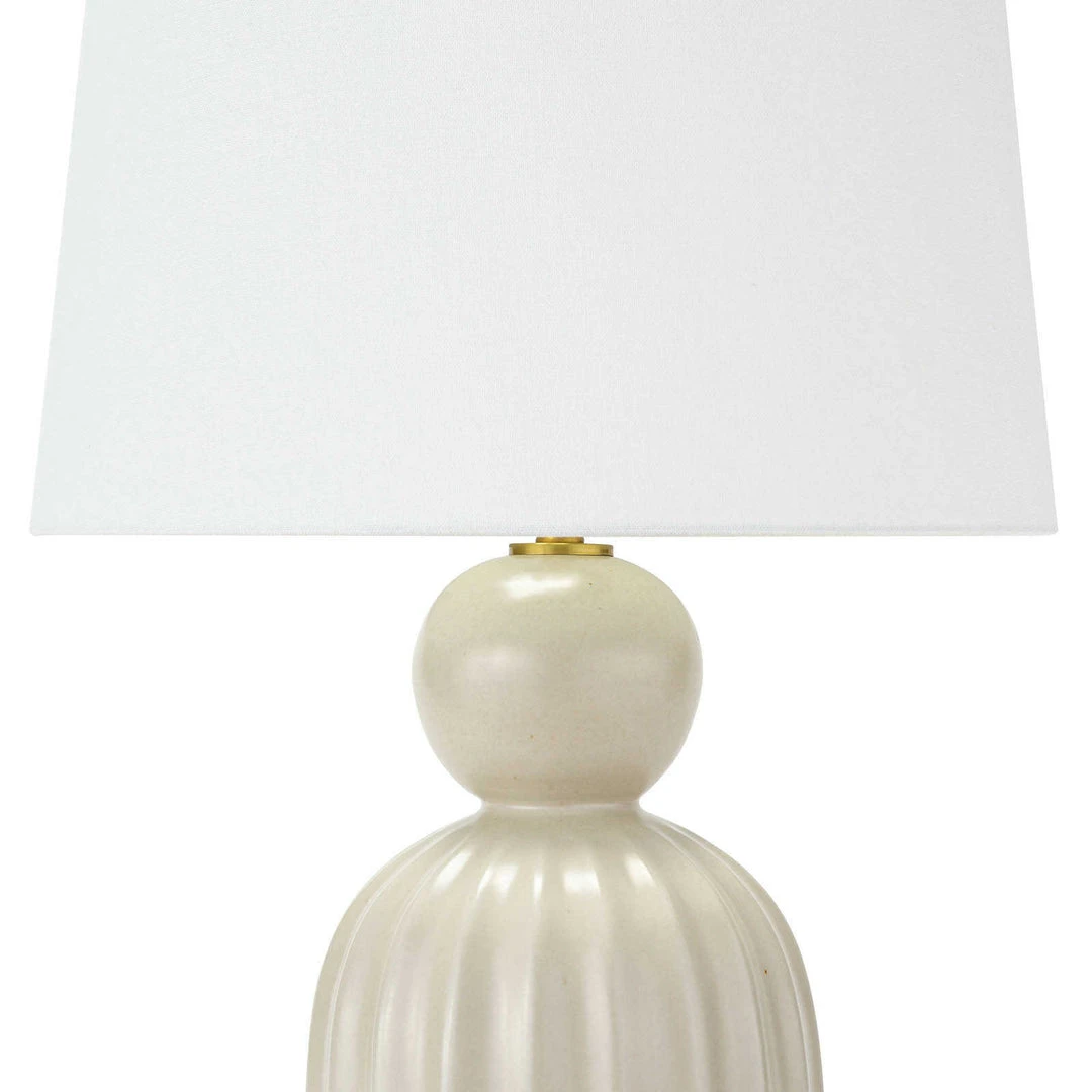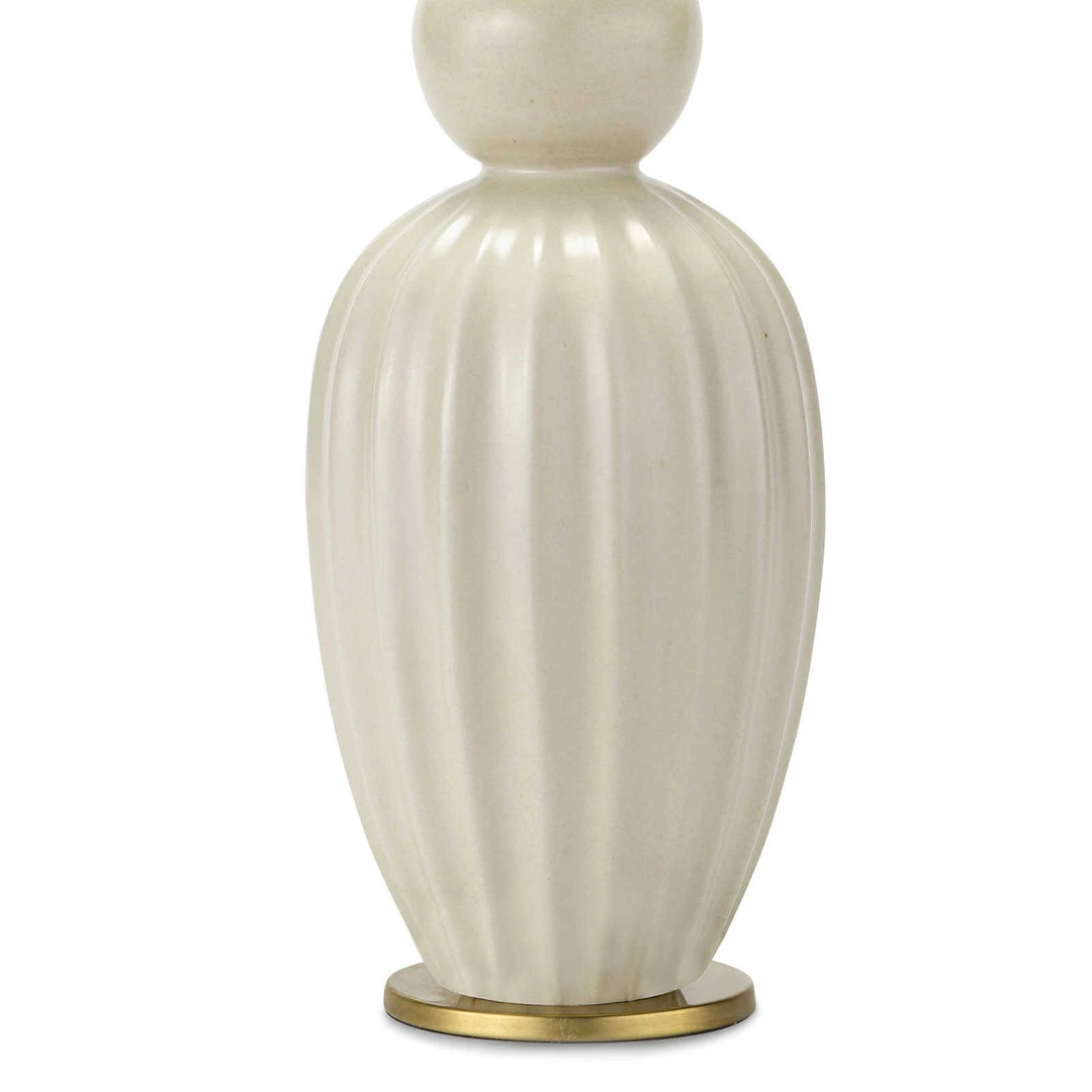 This neutral, modern beauty is a versatile ceramic statement lamp. With an organic shapely body that includes carved pleating and a warm, creamy, semi-matte glaze, the Tierra is an ideal lamp for a chic, modern space. Place her in a bedroom or living room with a few plants plus some natural lighting and let her shine. The Tierra is finished with a simple, natural brass disc base and topped with a tapered natural linen shade.