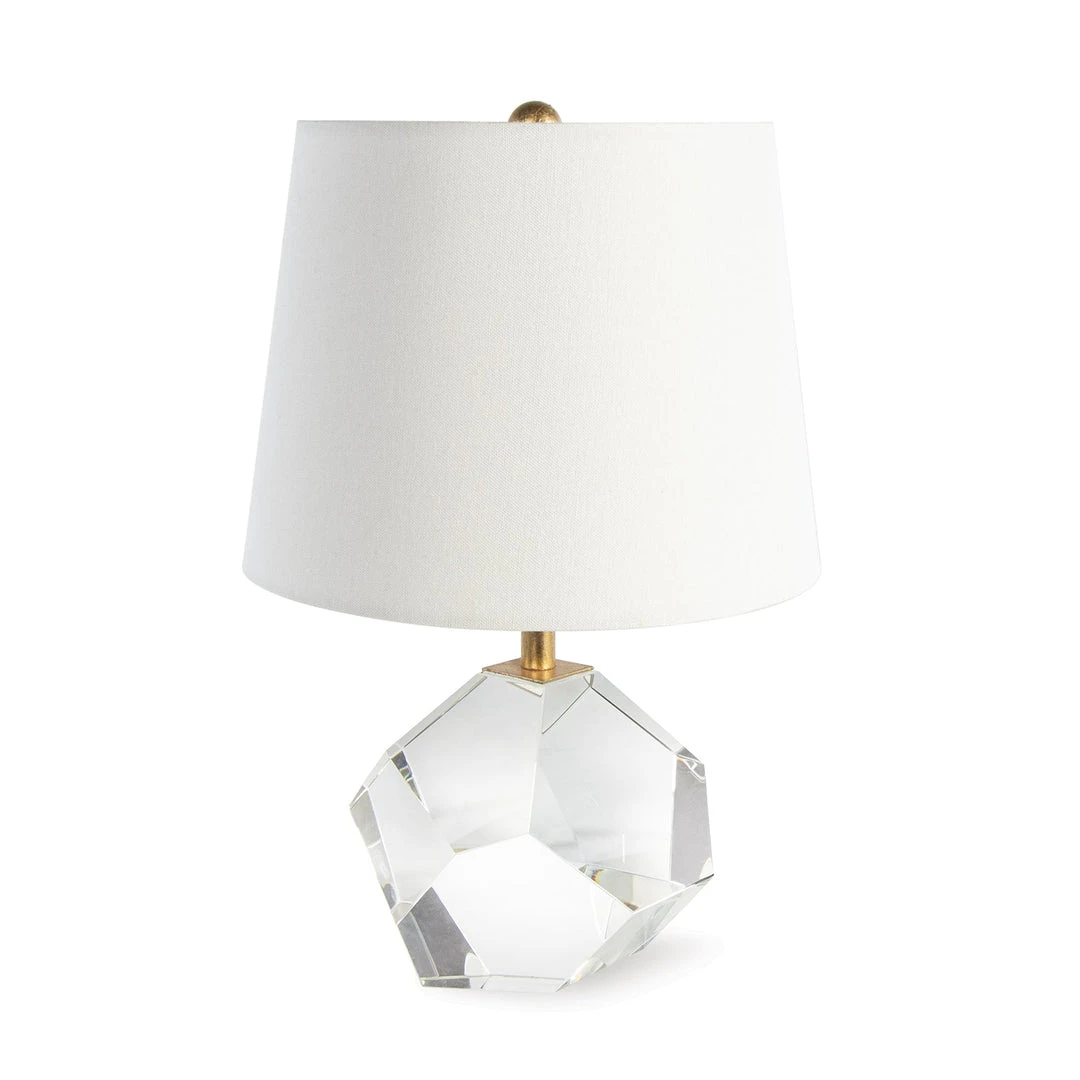 Add a splash of drama to your space with the hand polished faceted clear crystal base of this modern mini lamp. Light, both natural and artificial cascade over and through the crystal facets creating stunning light play to accent a shelf, etagere, desk or side table. Finished with gold leaf accents and a ball finial atop a tapered, natural linen shade. Add the Celeste Mini Lamp to your home office, bedroom or living space.