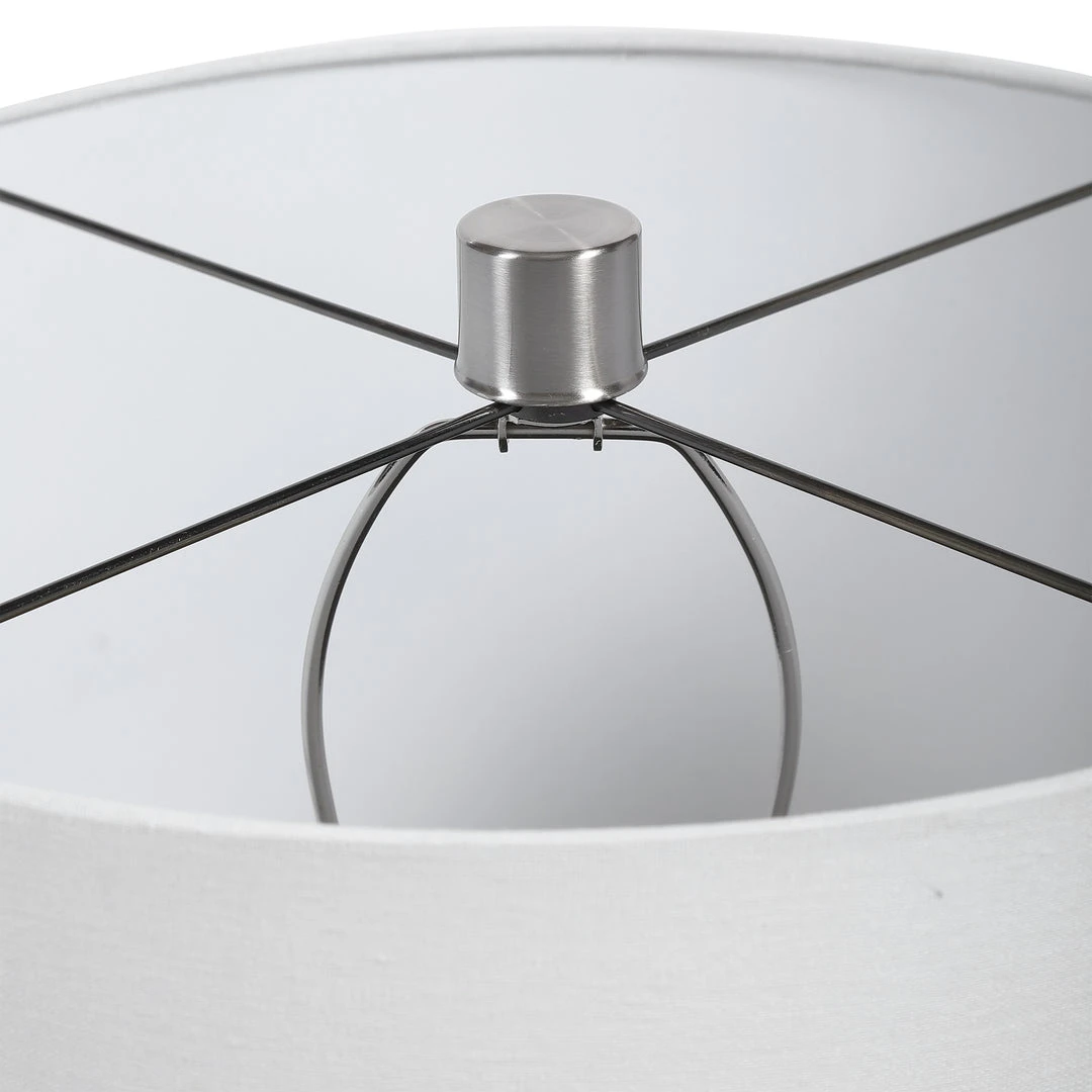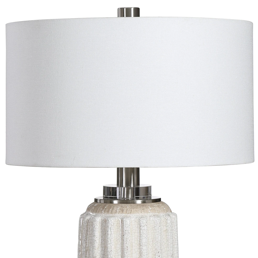A Nod To Old World Style, This Ceramic Table Lamp Features A Distressed Cream And Beige Crackle Glaze With A Deep Ribbed Texture, Accented By Brushed Nickel And Crystal Details. A White Linen Fabric Drum Shade Completes The Look.