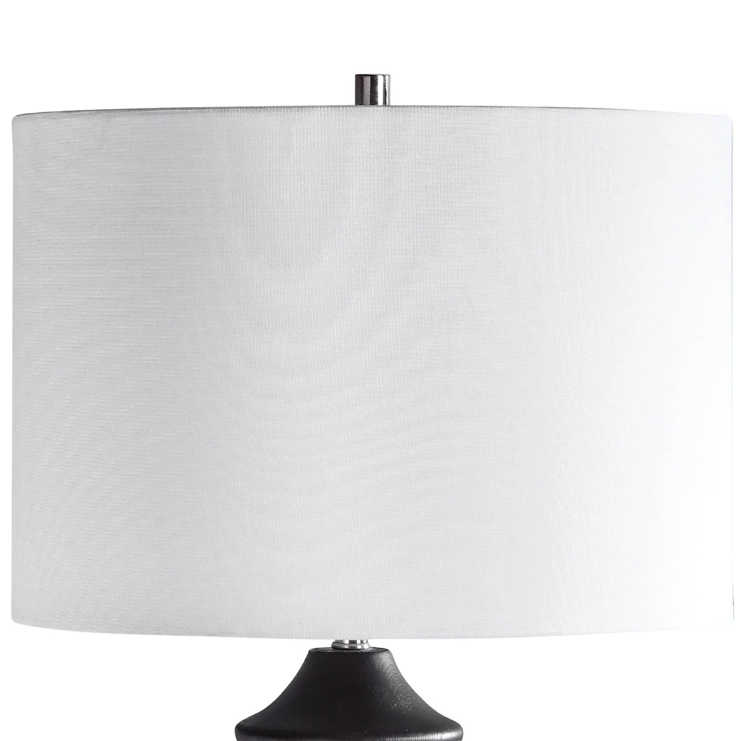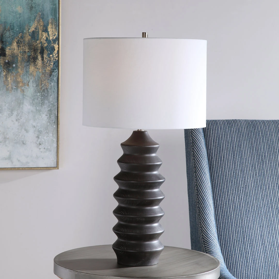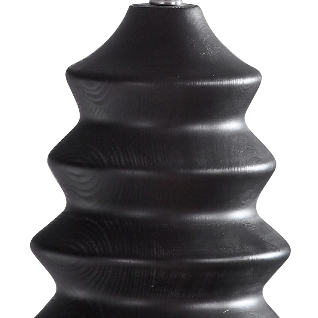 Showcasing A Modern Lodge Style, This Table Lamp Features A Carved Wood Base Finished In A Rustic Black Stain Exposing Subtle Wood Grain. The Lamp Is Paired With A Round Hardback Drum Shade In A White Linen Fabric.