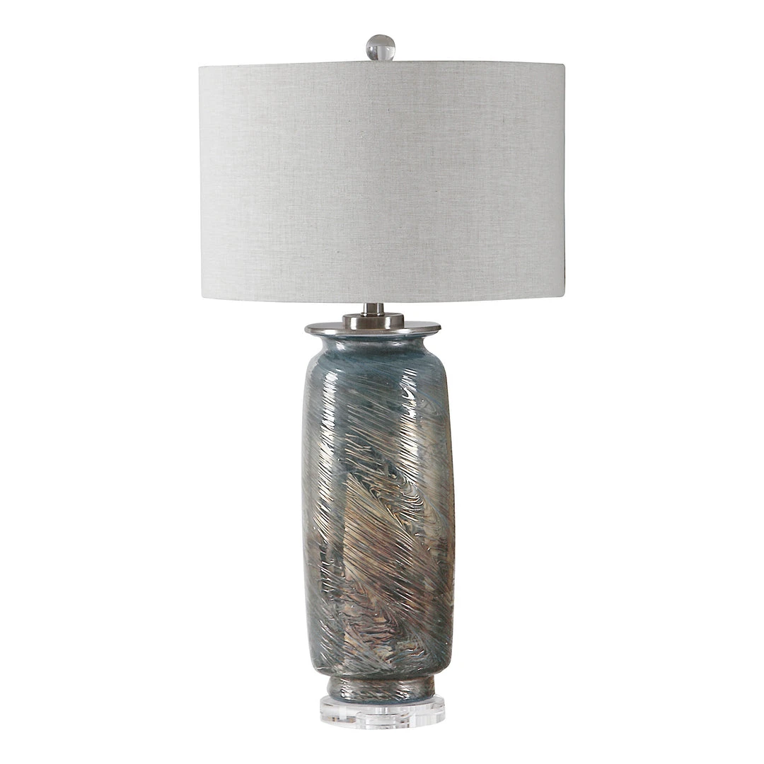This Table Lamp Features A Decorative Glass Base That Showcases A Unique Swirl Texture, Highlighting Shades Of Ocean Blues, Greens And Metallic Bronze. Accenting These Vibrant Colors Are Brushed Nickel Plated Details And A Thick Crystal Foot. The Round Hardback Drum Shade Is A Light Beige Linen Fabric With Natural Slubbing.