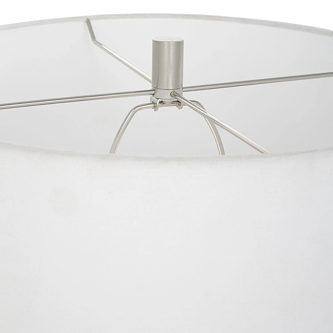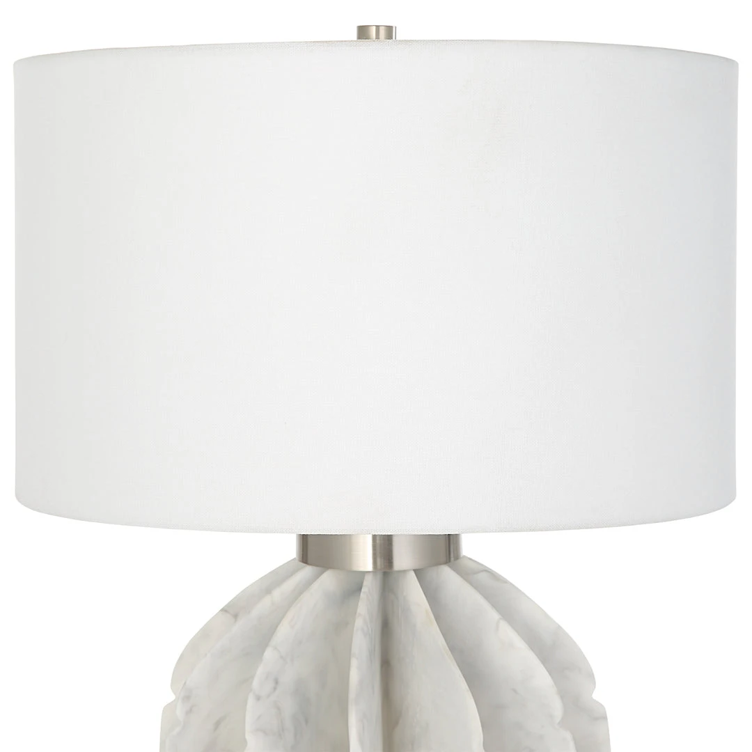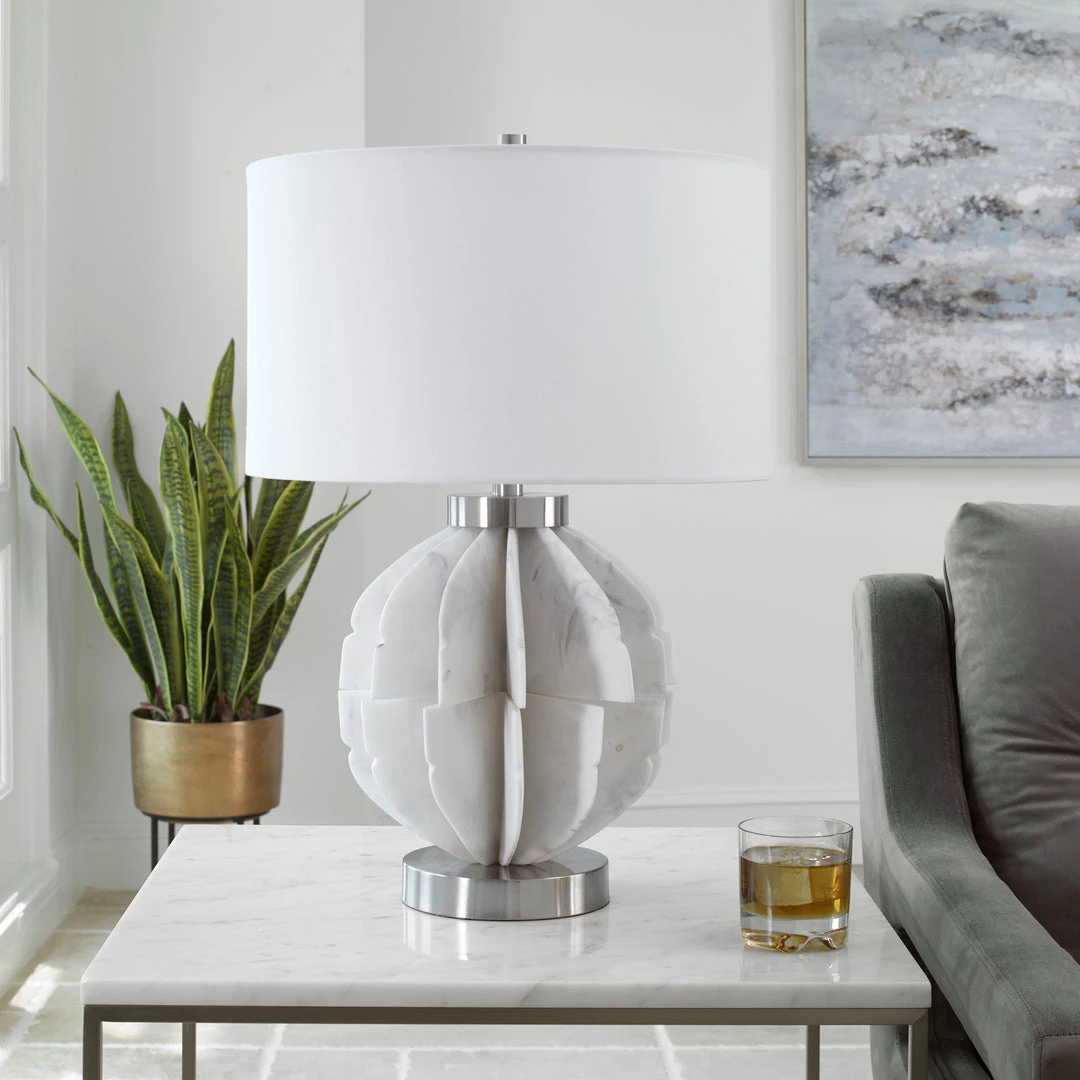 This Contemporary Table Lamp Features Thin Stacked Blades That Create An Organic Sphere Finished In A White Marble Look Accented By Plated Brushed Nickel Accents. The Lamp Is Paired With A White Fabric Drum Shade.