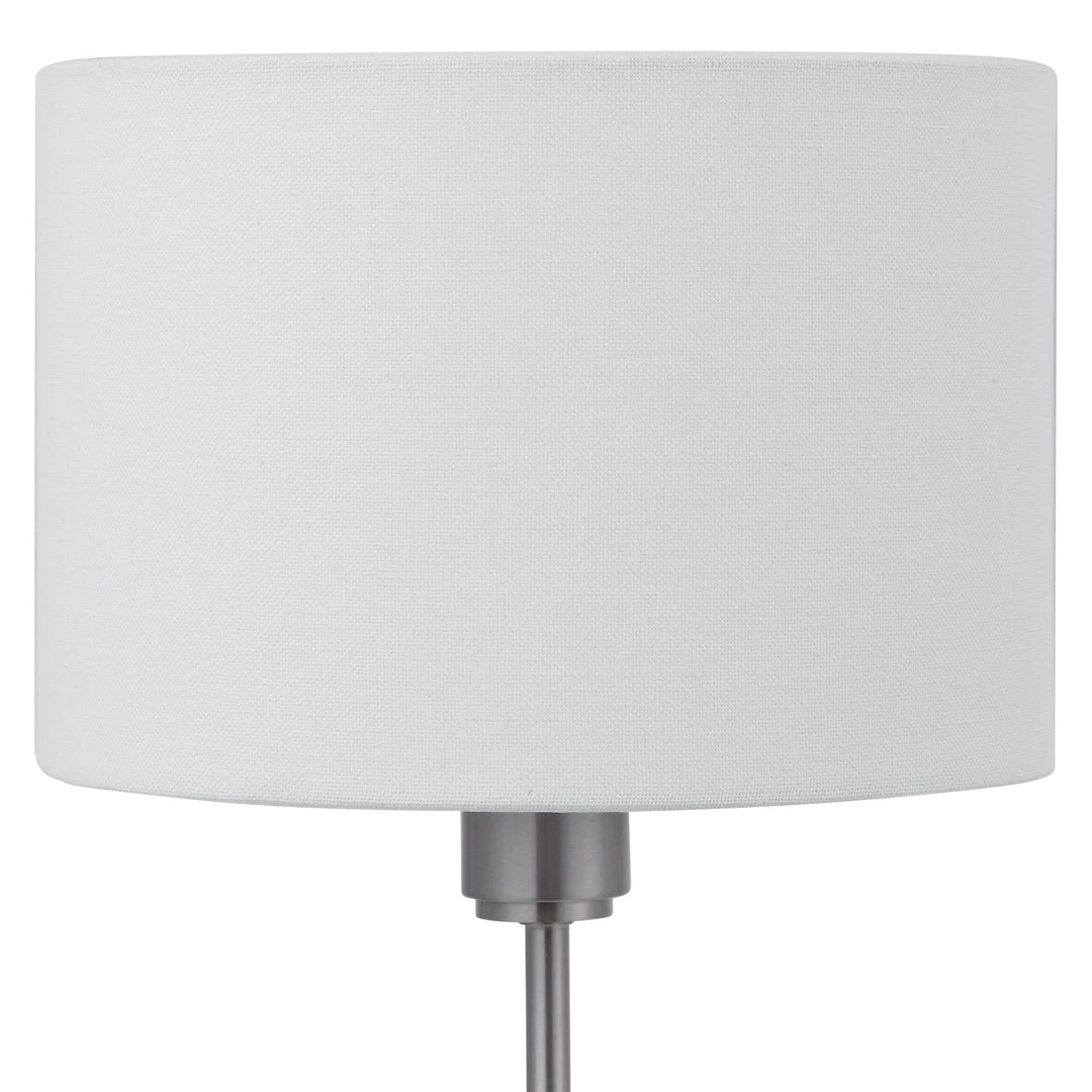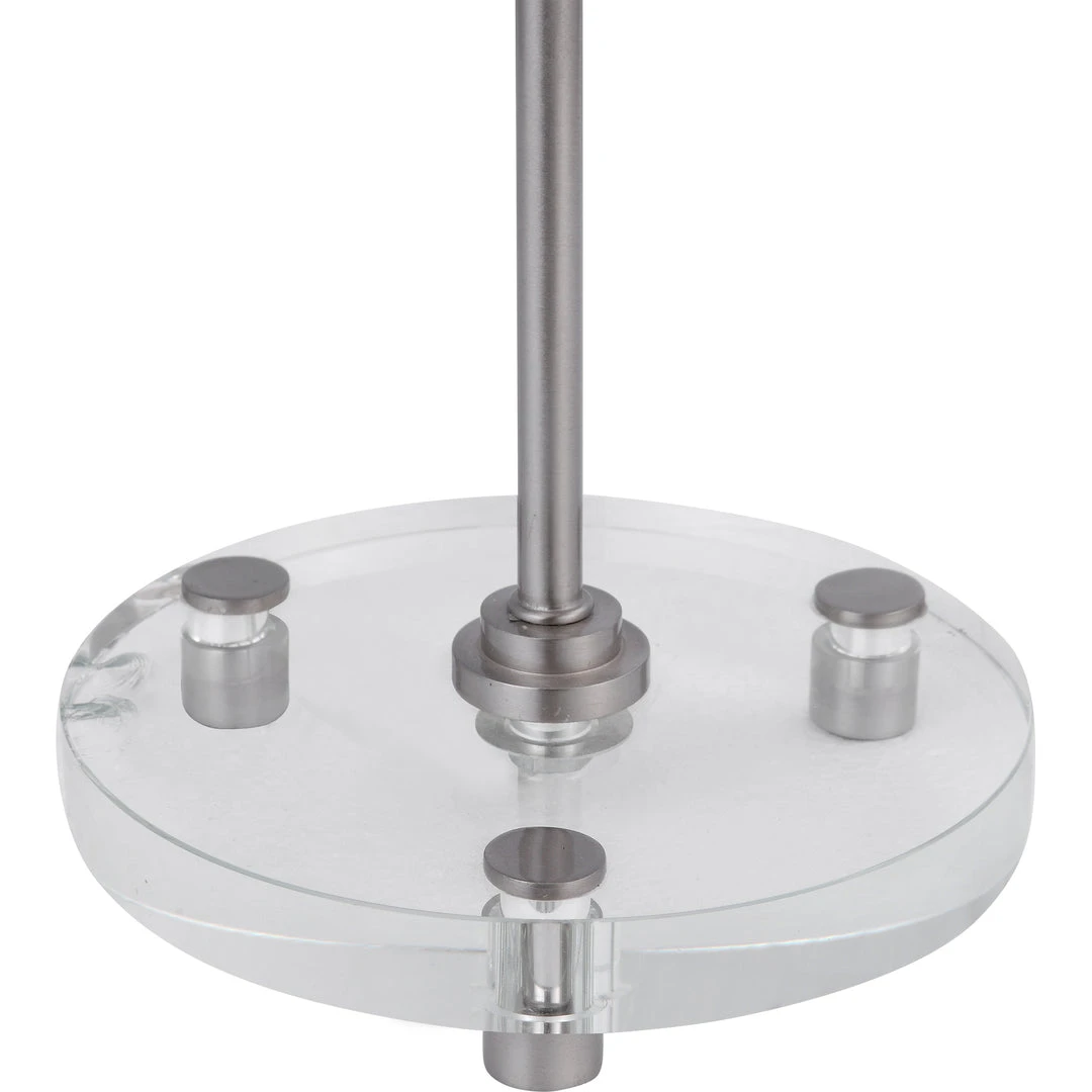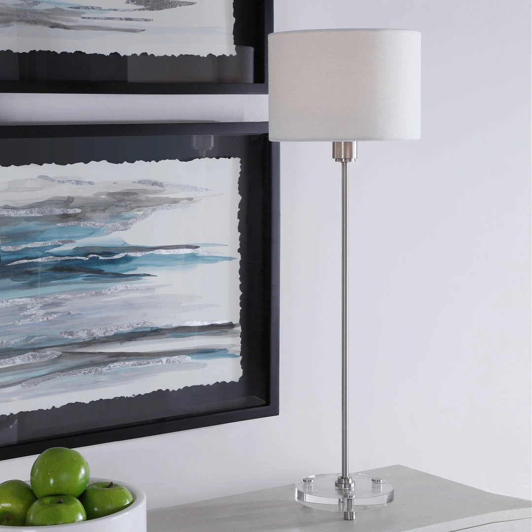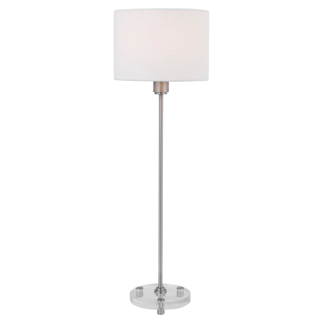 This Simple, Contemporary Table Lamp Features Clean Lines And A Versatile Style. The Iron Base Is Finished In A Plated Brushed Nickel, Displayed On A Thick Crystal Foot. The Round Hardback Drum Shade Is A White Linen Fabric.