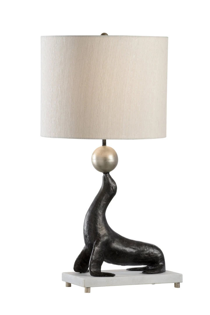 The Seal Tricks Silver Lamp Has A Silver Ball That Sits On A Gray Seal Sculpture.