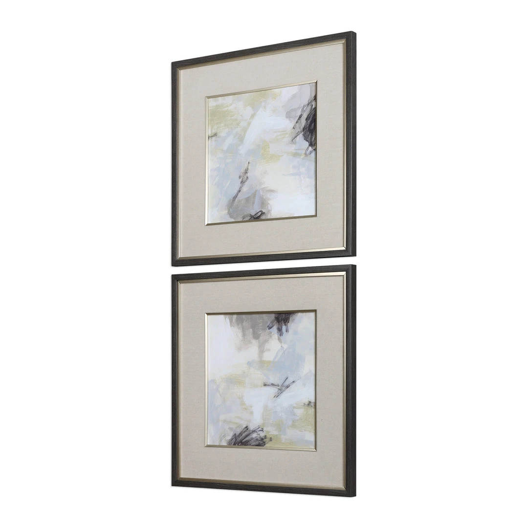 Pale Pastels Create A Calming Abstract Art Set. Muted Shades Of Blue, Green, White, And Charcoal Make Up These Contemporary Pieces. Each Print Is Accented By An Oatmeal Linen Mat. Frames With A Faux Wood Grain Finish And Charcoal Coloring Are Paired With Matching Silver Champagne Inner Lips And Fillets. Each Print Is Placed Under Protective Glass.