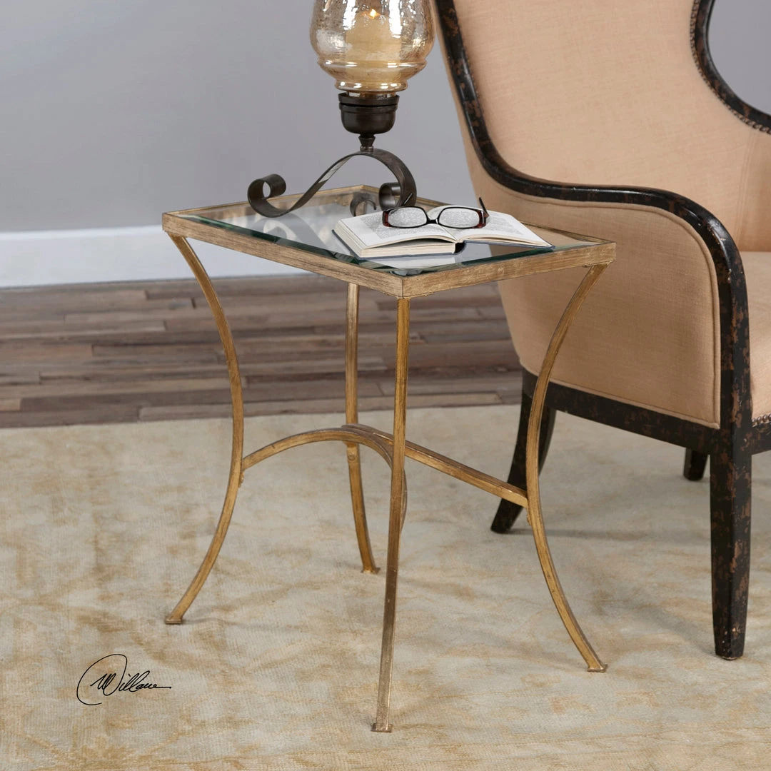 Gracefully Arched Hand Forged Iron Finished In Heavily Antiqued Gold Leaf. Top Is Clear Beveled Tempered Glass.