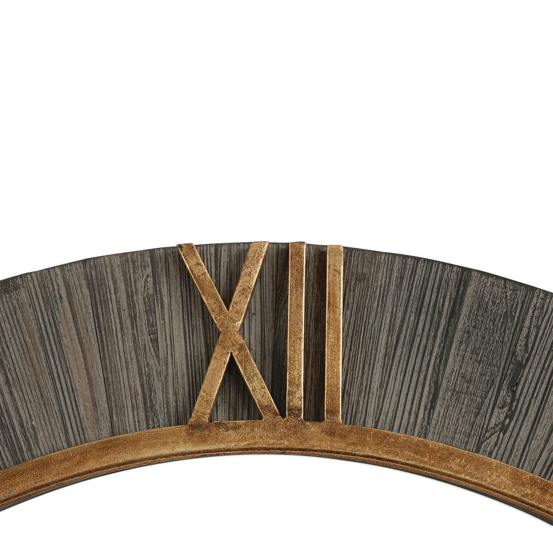 Wall Clock Features Charcoal Stained Fir Wood With Antiqued Gold Accents And Floating Center Dial. Quartz Movement Ensures Accurate Timekeeping. Requires One “C” Battery.