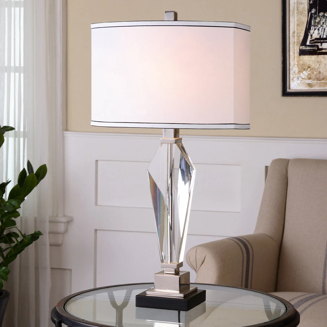 Cut Crystal Accented With Polished Nickel Plated Details And A Black Foot. The Oval Hardback Shade Is A White Linen Fabric With Black Double Trim And Straight Sides.
