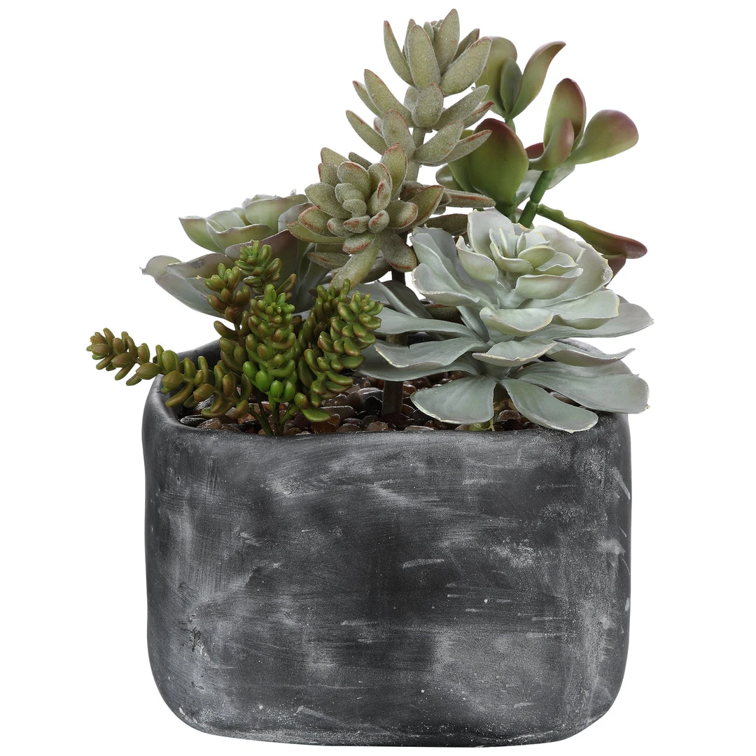 A Contemporary Desert Garden Mix Of Succulents Accented With An Arid Bed Of Natural Pebbles In A Mottled Charcoal Gray Concrete Planter.
