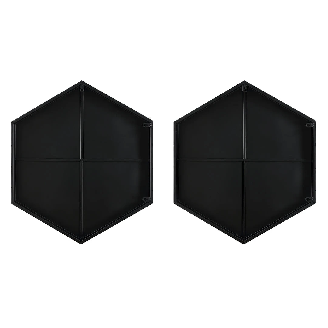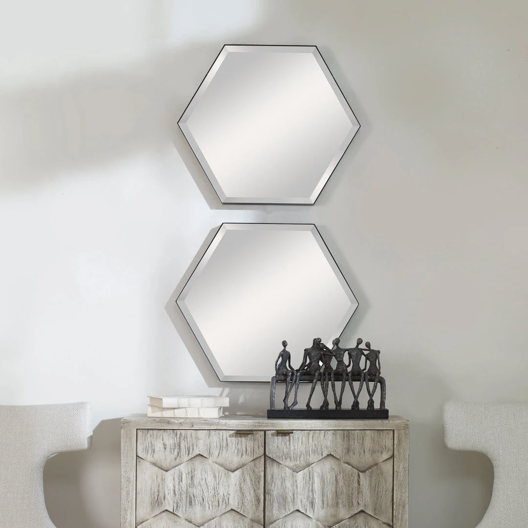 This Set Of Two Hexagon Mirrors Are Encased In Thick Iron Bands Finished In A Soft Matte Black. Each Mirror Has A 1″ Bevel And May Be Hung Horizontal Or Vertical.