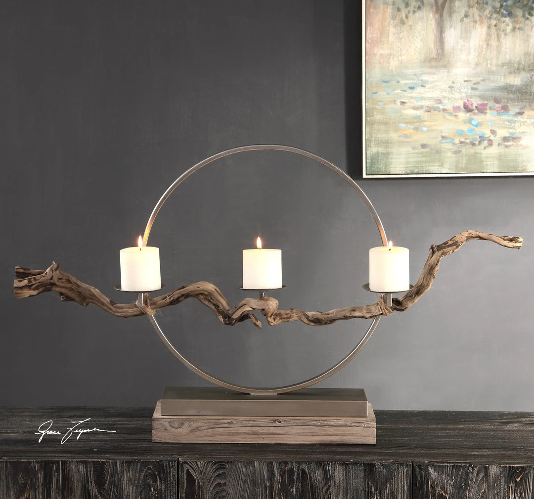 Lightly Antiqued Silver Champagne Iron Ring Features A Natural Twig Stretched Across The Front And Attached With Rope, The Base Is Natural Fir Wood. Includes Three, 3″x 3″ Distressed Off-white Candles. Due To The Authentic Nature Of The Twig, Size And Shape Will Vary Slightly.