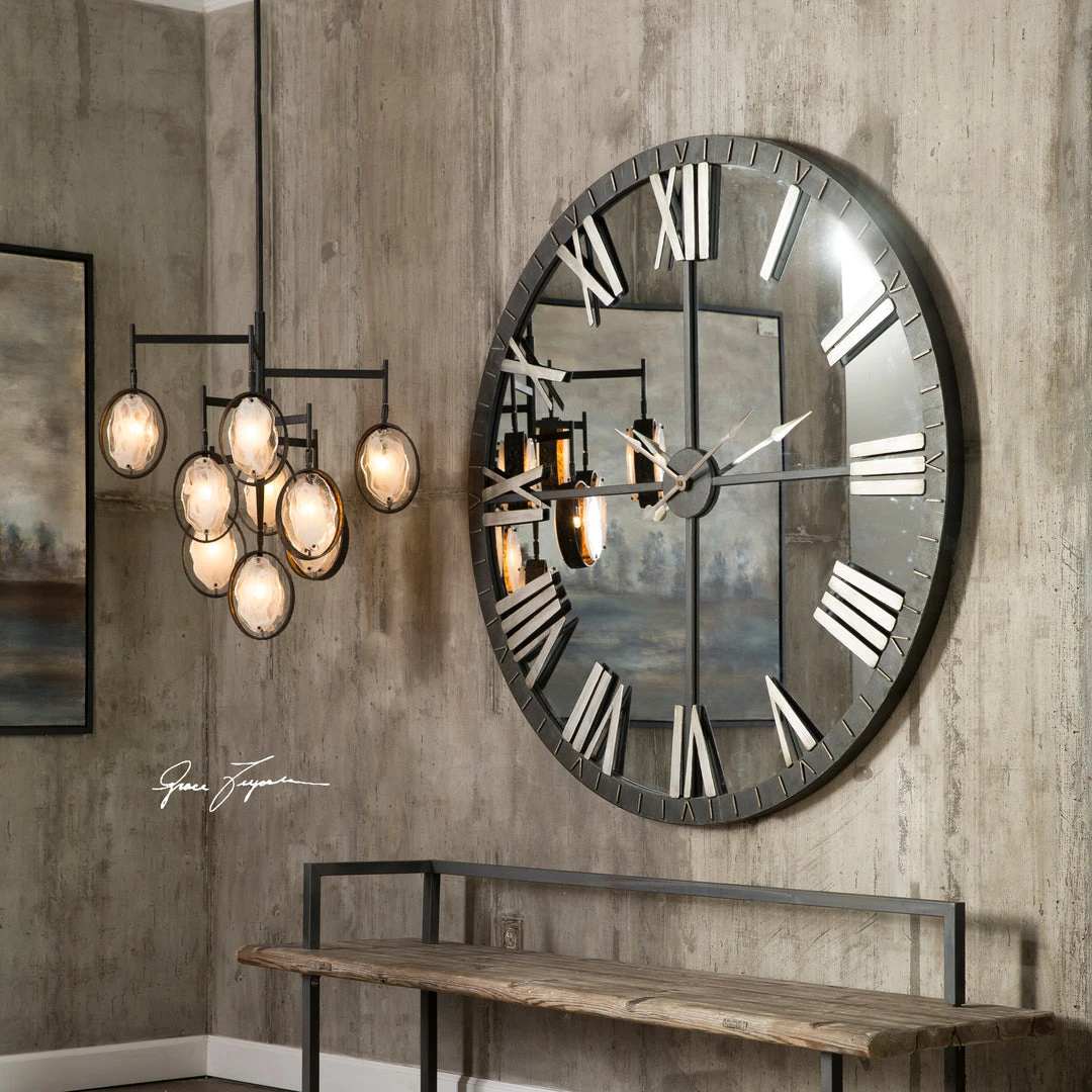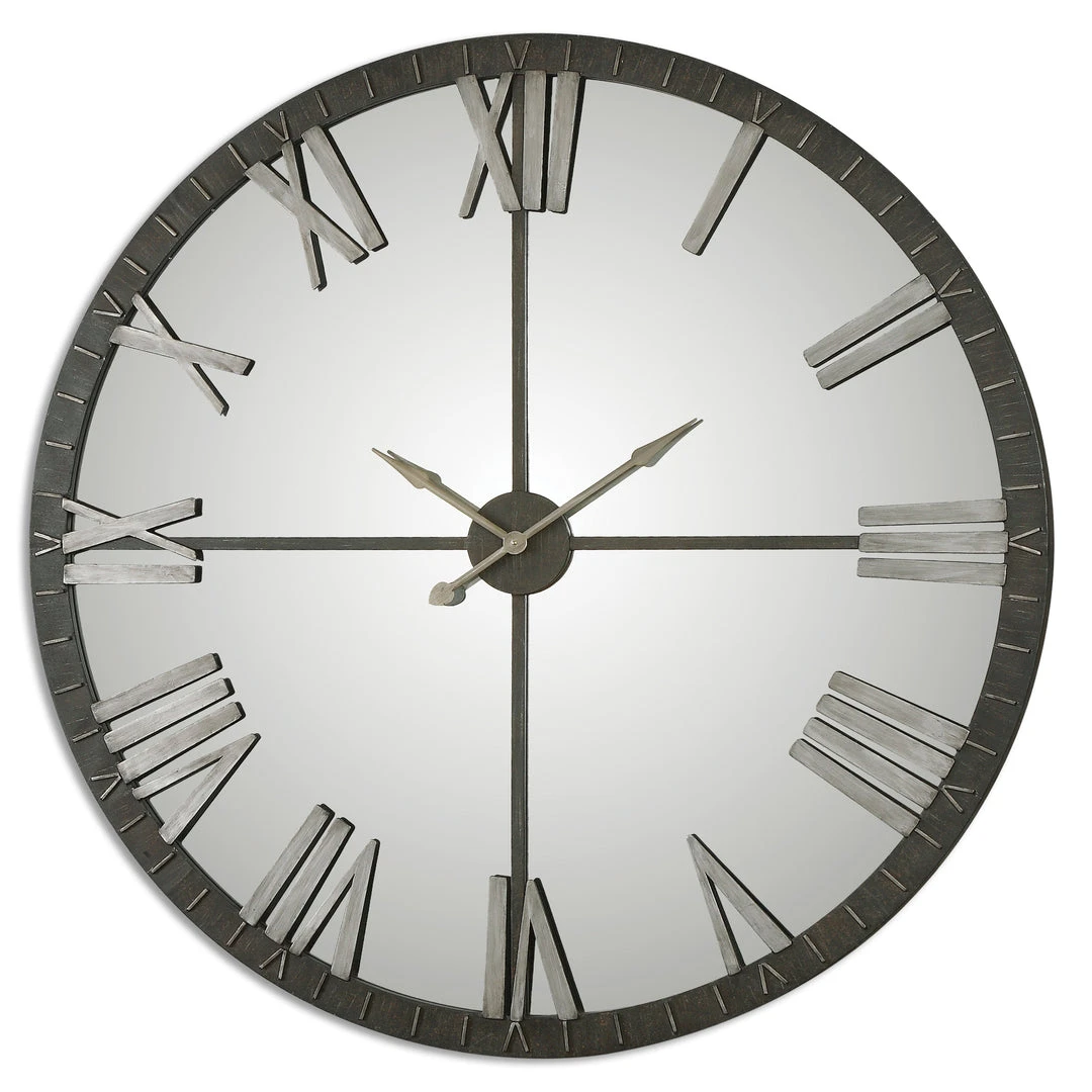 Oversized Wall Clock Featuring A Distressed, Rustic Bronze Metal With Silver Highlights And Mirrored Face. Quartz Movement Ensures Accurate Timekeeping. Requires One “AA” Battery.