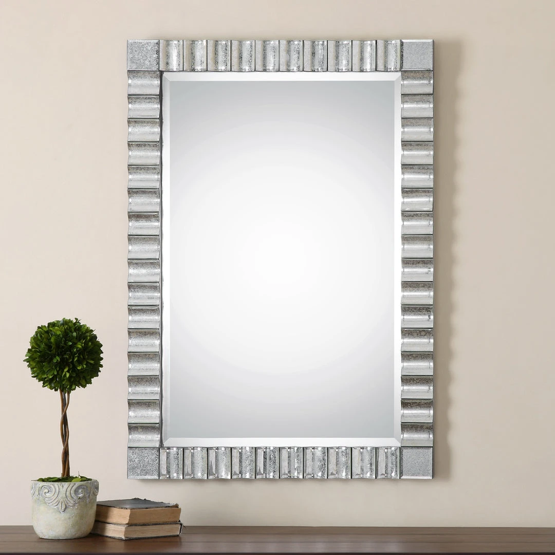 This Frame Features Individual Antiqued Mirrors With A Scalloped Design And Subtle Beveled Edges. Center Mirror Has A Generous 1 1/4″ Bevel. May Be Hung Horizontal Or Vertical.