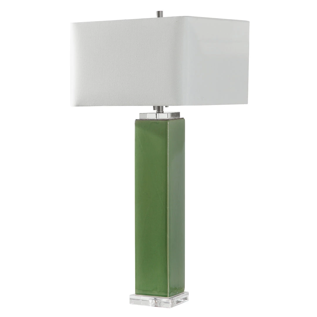 Finished In A Striking Tropical Green Glaze, This Ceramic Table Lamp Is Accented By Thick Crystal Ornaments And Brushed Nickel Accents. The Square Hardback Shade Is A White Linen Fabric.