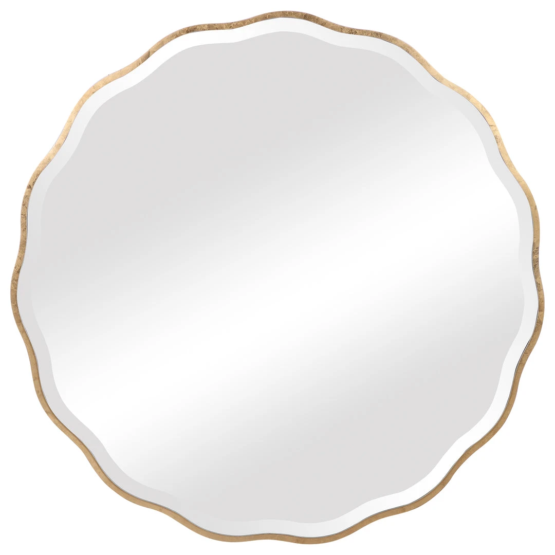 Showcasing A Feminine Scalloped Edge, This Shaped Wood Mirror Adds Whimsical Flair To Any Design. The Mirror Is Finished In Aged Gold And Has A 1 1/4″ Bevel.