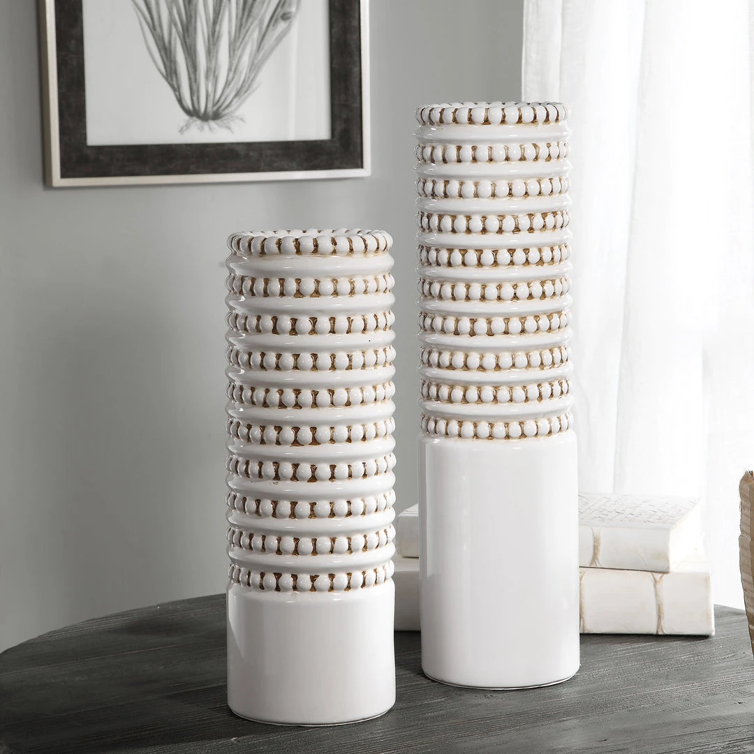 Set Of Two Ceramic Vases Finished In A White Glaze With Taupe Accents, Beaded Texture, And A Ribbed Interior. Sizes: Sm-5x14x5, Lg-5x18x5