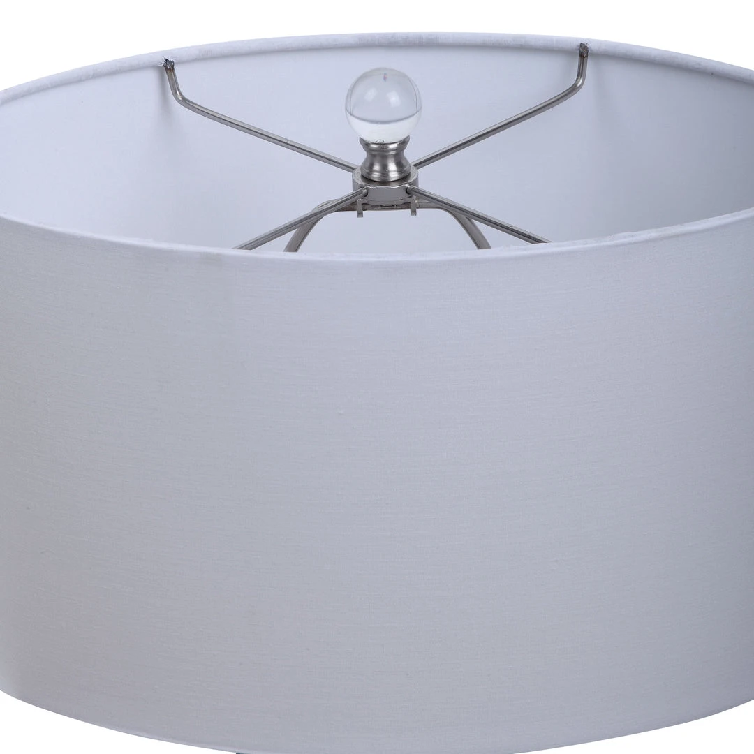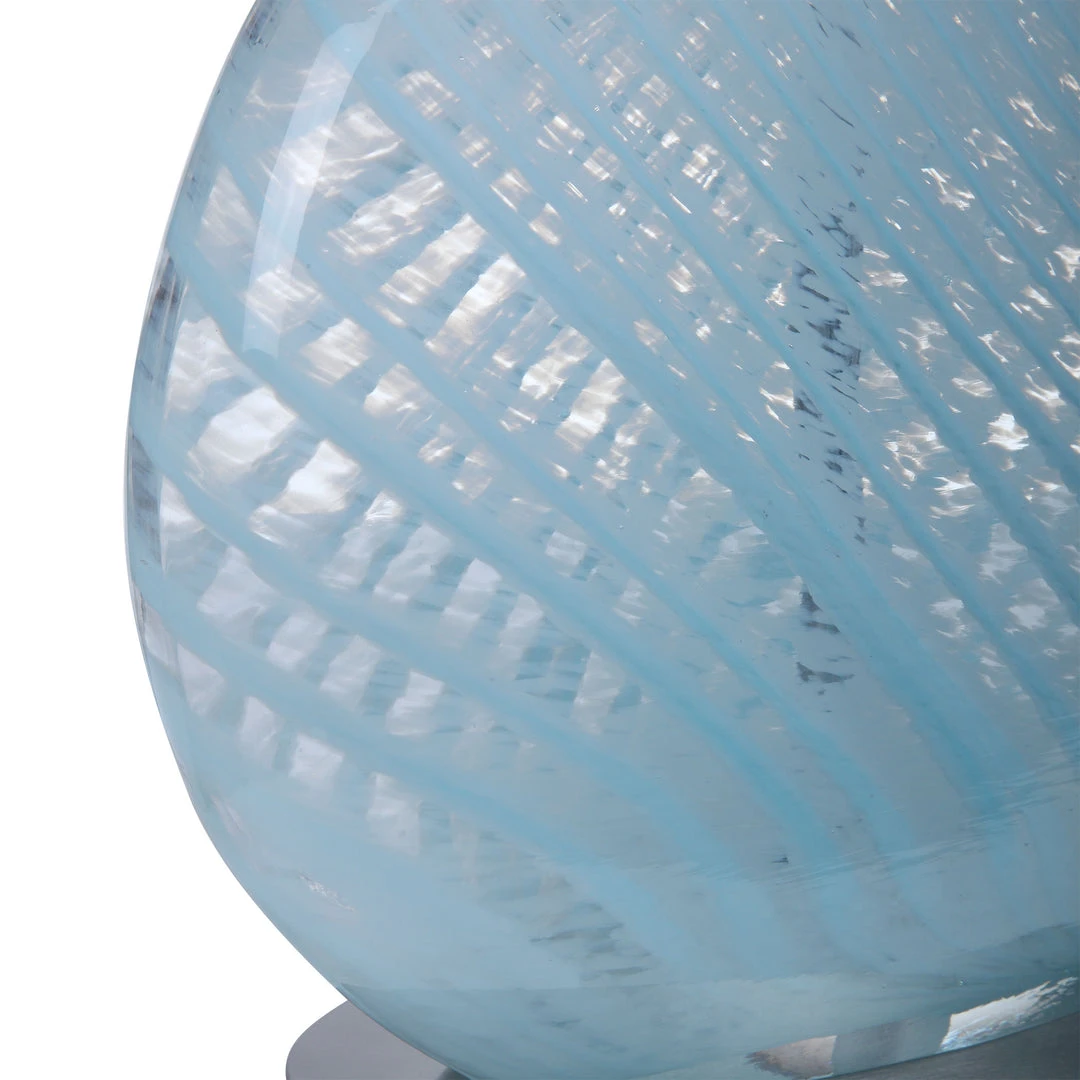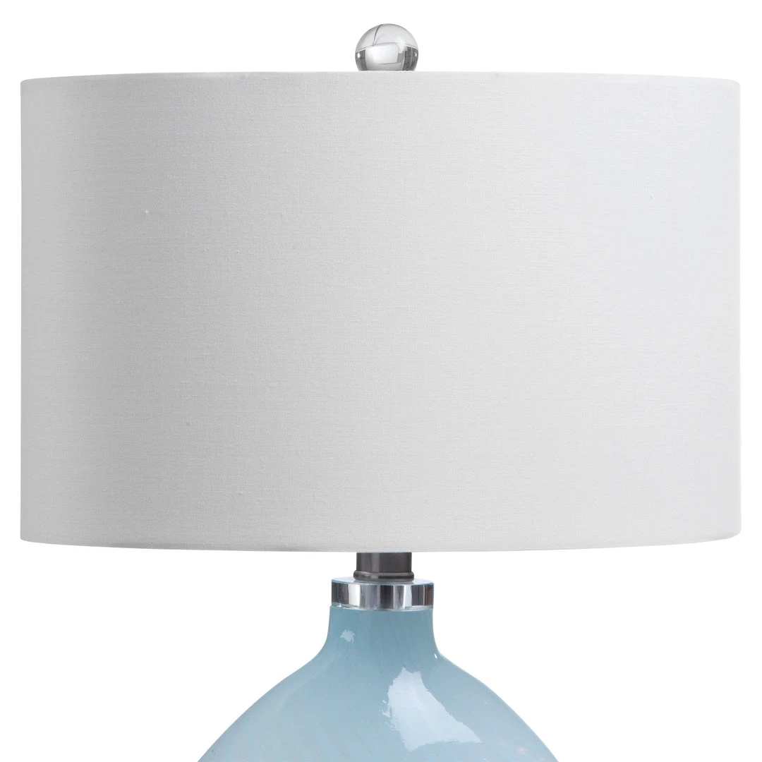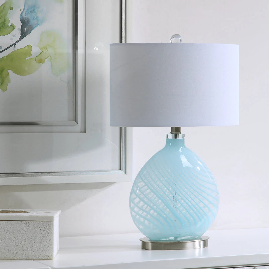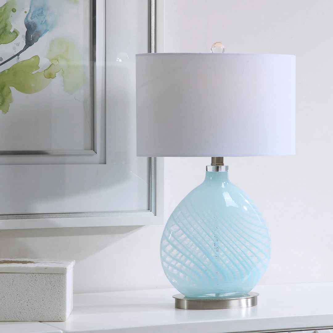Displaying A Coastal Color Way, This Table Lamp Features An Elegant Light Blue And Translucent Glass Base With Wavy Details And Brushed Nickel Accents. The Lamp Is Paired With An Oval Hardback Shade In An Off-white Fabric.