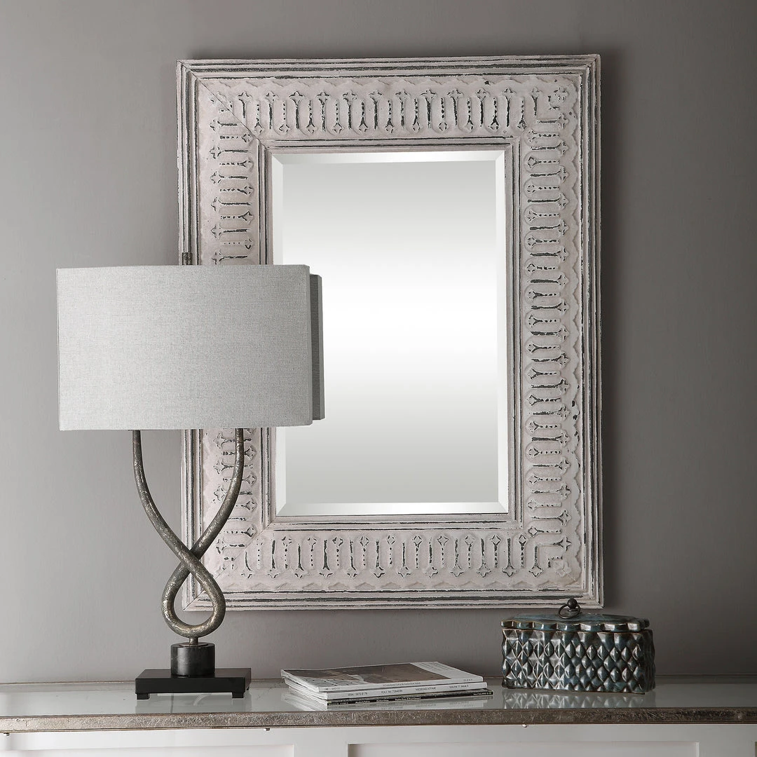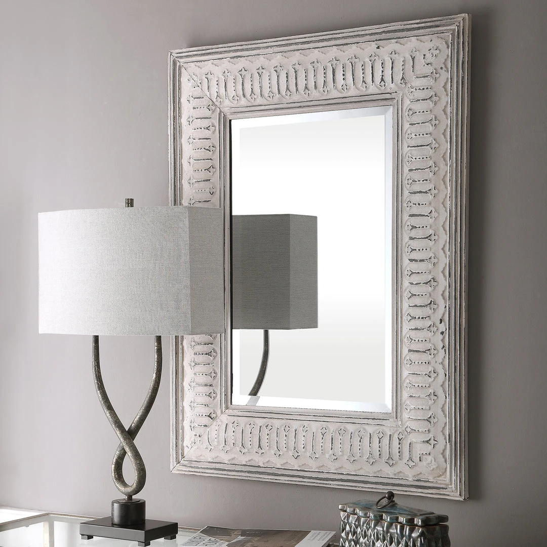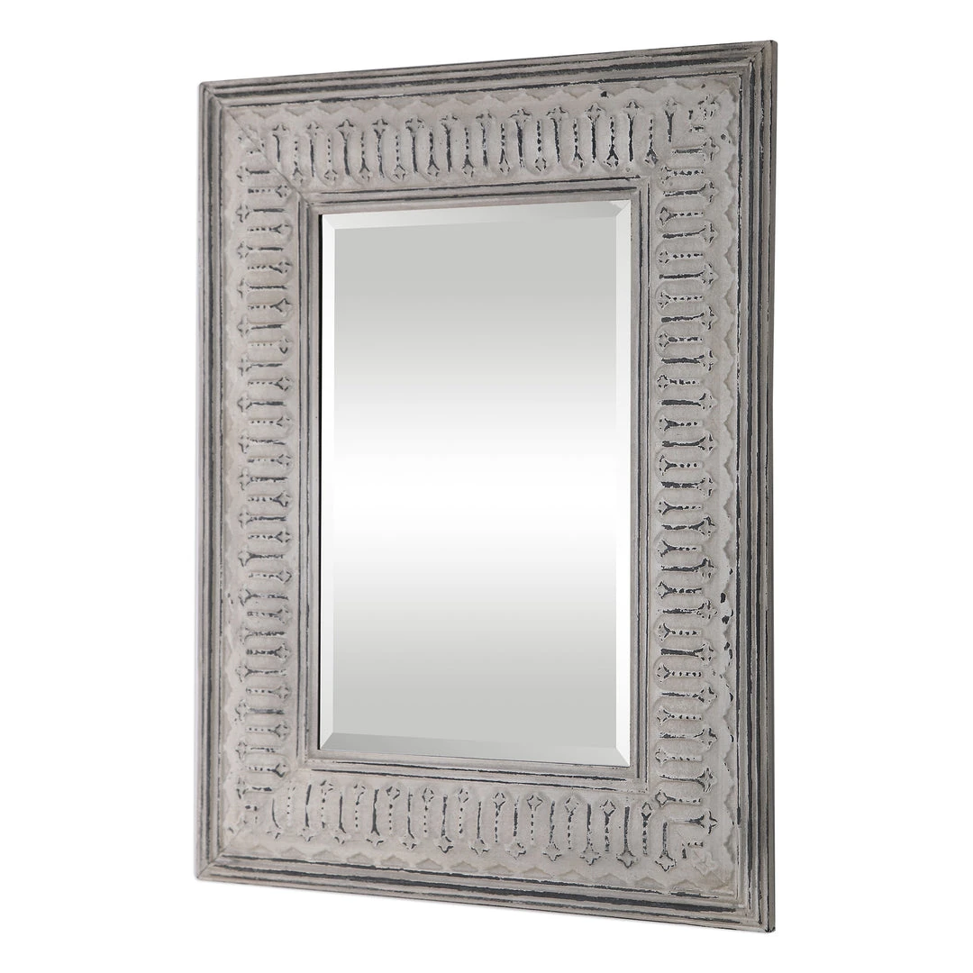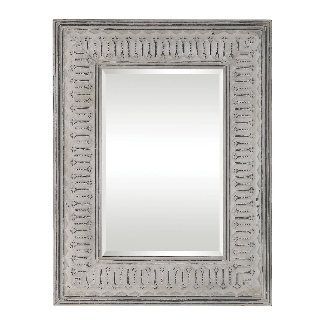 Hand Forged Iron Featuring An Embossed Decorative Design, Finished In A Distressed Taupe Ivory Wash, With Aged Gray Undertones. Mirror Features A Generous 1 1/4″ Bevel. May Be Hung Horizontal Or Vertical.
