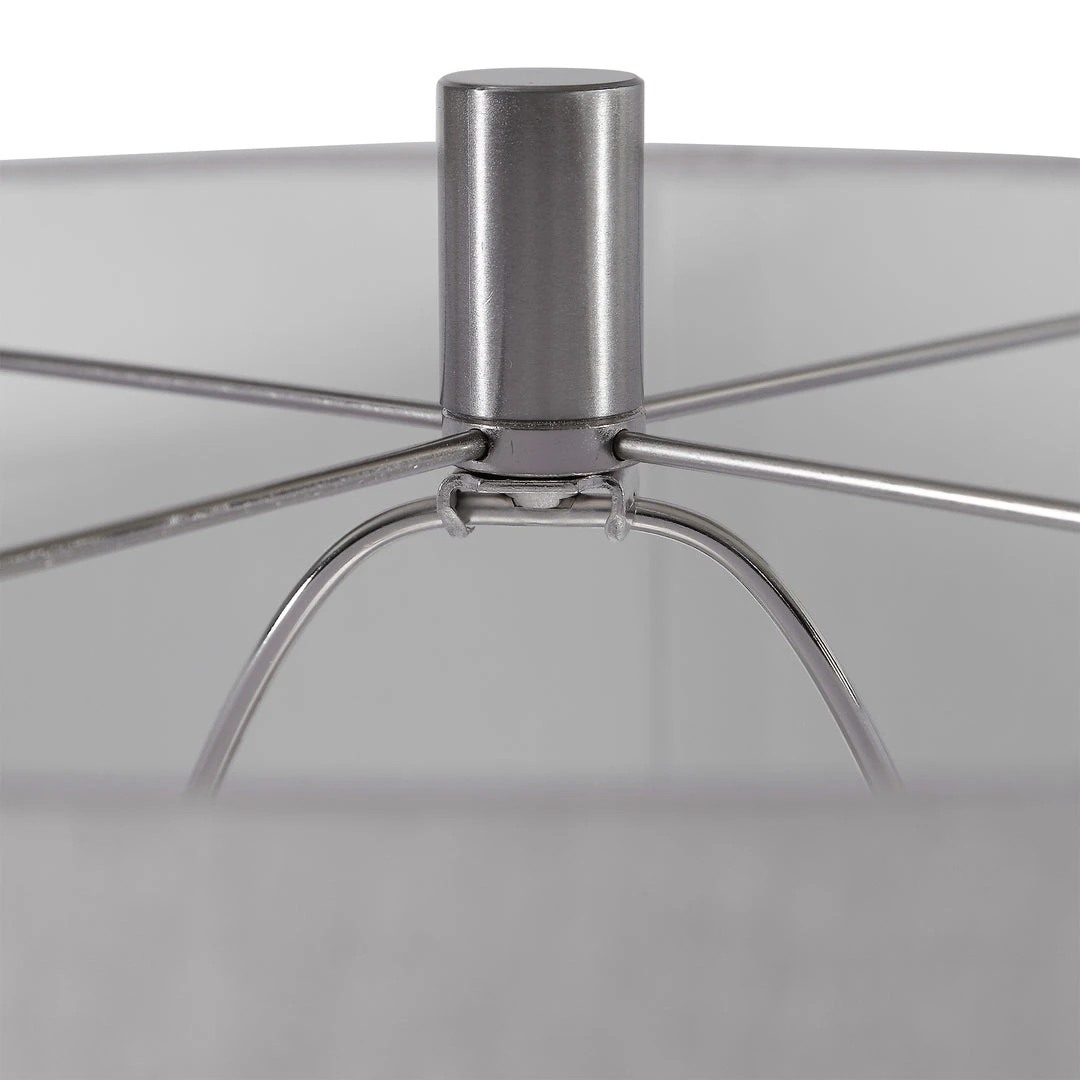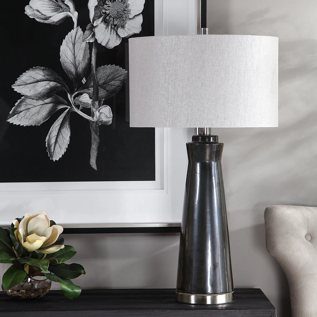 Contemporary In Style, This Ceramic Table Lamp Is Finished In A Glossy Dark Charcoal Glaze, Accented With Brushed Nickel Plated Details. The Hardback Drum Shade Is Light Beige Linen Fabric With Gray Striations.