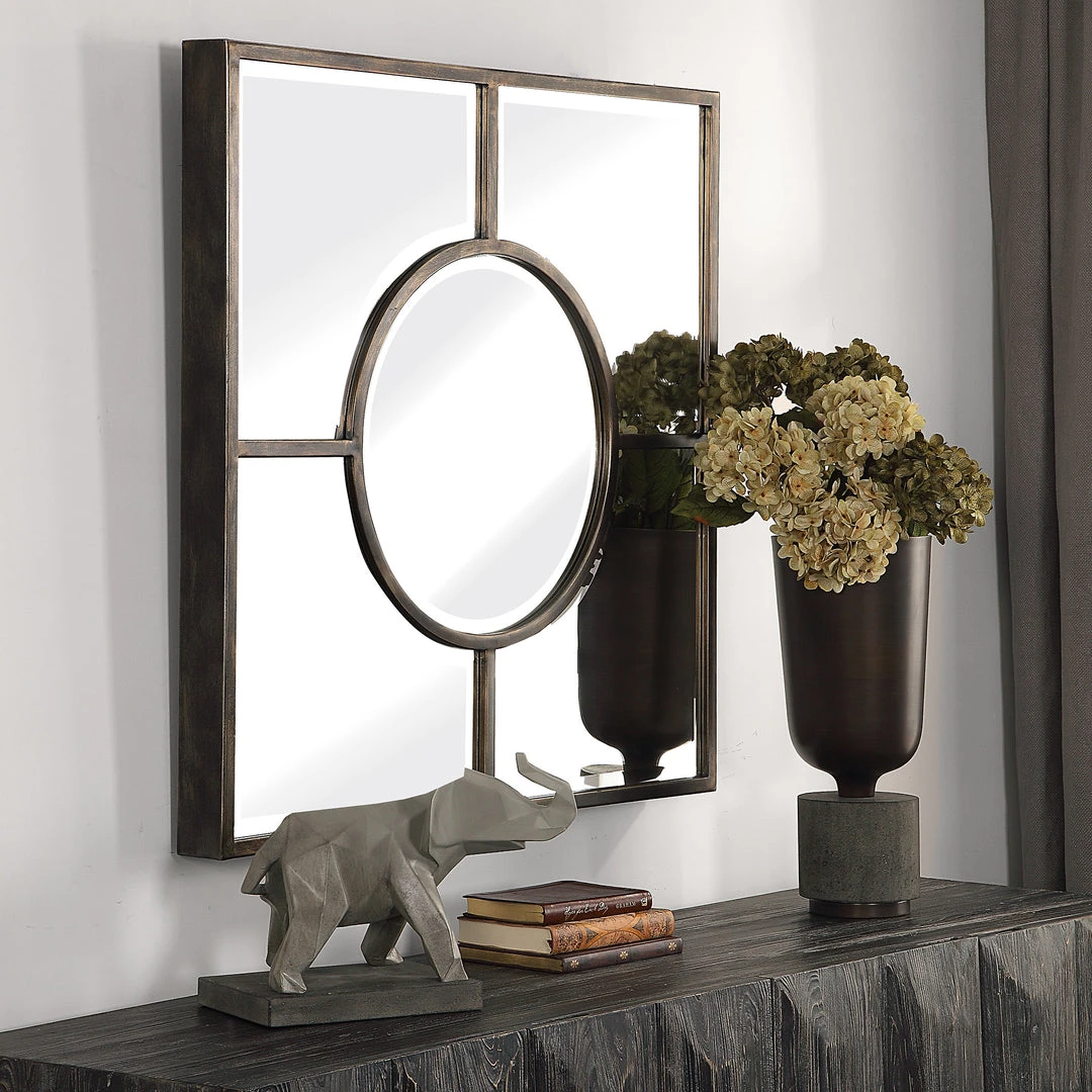 Sophisticated And Versatile, This Mirror Frame Is Made From Forged Iron, Finished In A Rich Dark Bronze, Encasing Gracefully Curved Beveled Mirrors. Mirror Features A Generous 1 1/4″ Bevel.