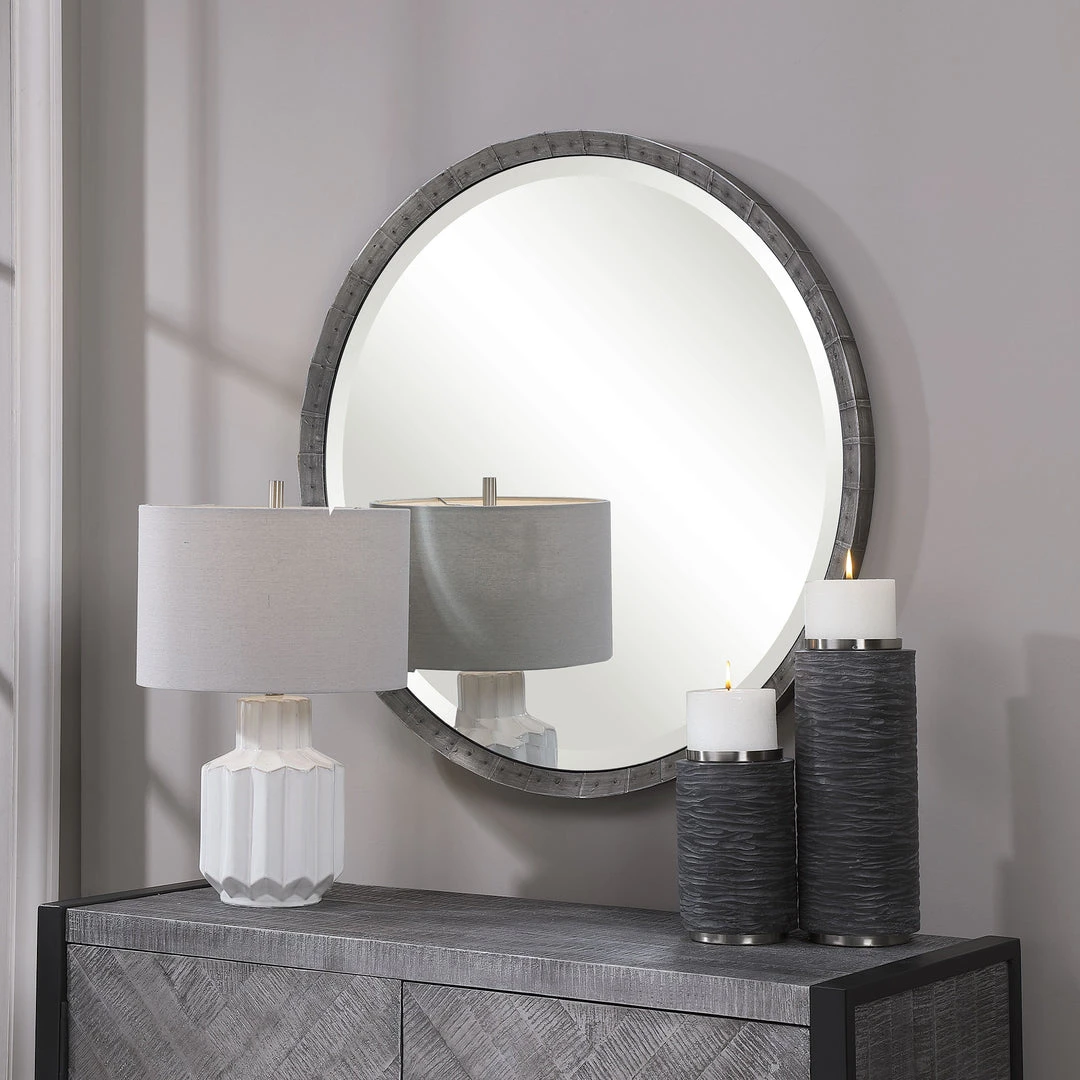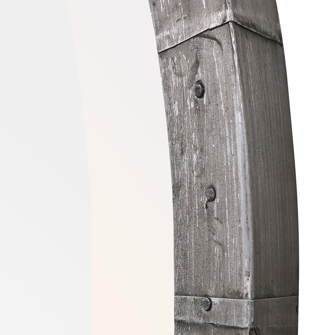 Inspired By Classic Industrial Style, This Round Mirror Is Covered In A Heavily Distressed Silver Aluminum Wrap With Exposed Nail Head Details. The Masculine Piece Is Accented By A 1 1/4″ Bevel.