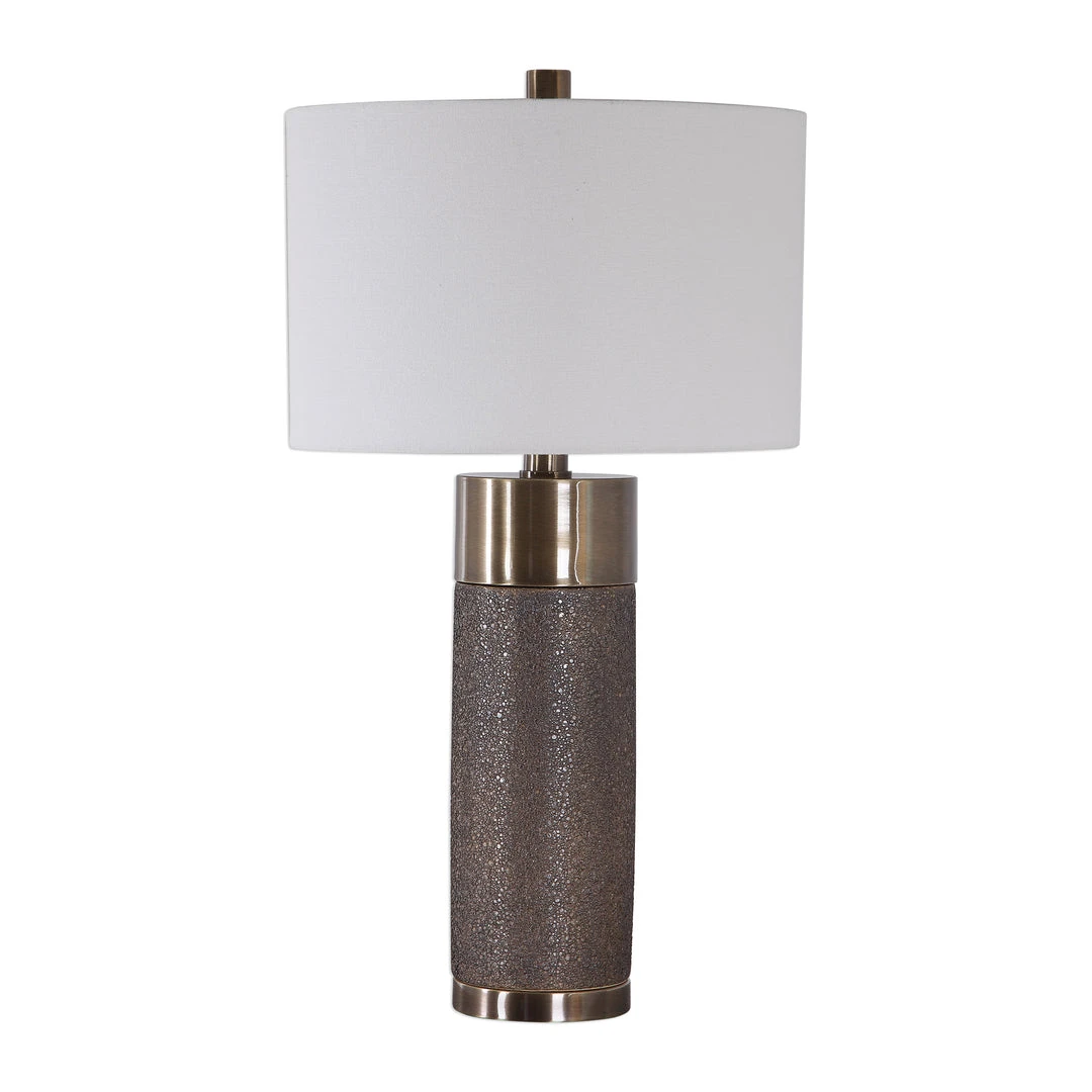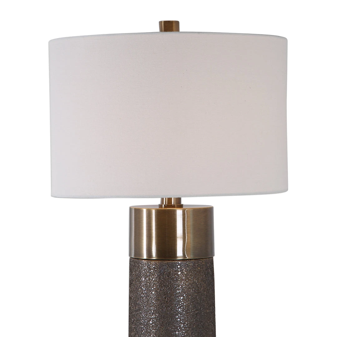 This Contemporary Table Lamp Design Showcases A Heavily Textured Ceramic Base Thats Finished In A Metallic Golden Bronze, Paired With Antique Brass Plated Iron Details. A Hardback Drum Shade In An Off-white Linen Fabric Completes This Piece.