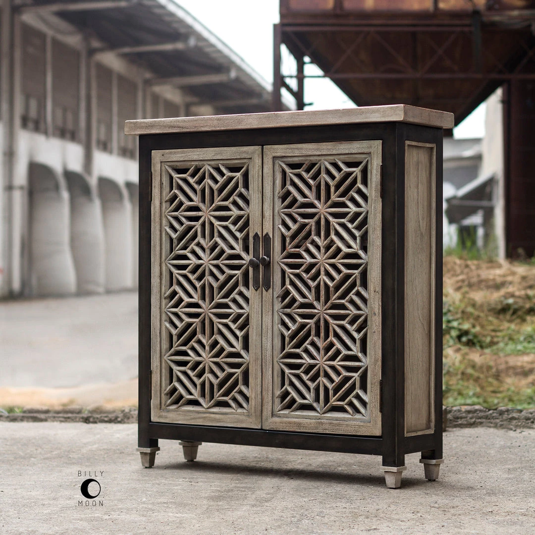 Beautifully Carved Open Fret Doors, In Aged White Mahogany Wood With A Light Gray Wash, Framed With Iron In A Worn Industrial Finish. Two Adjustable Interior Shelves.