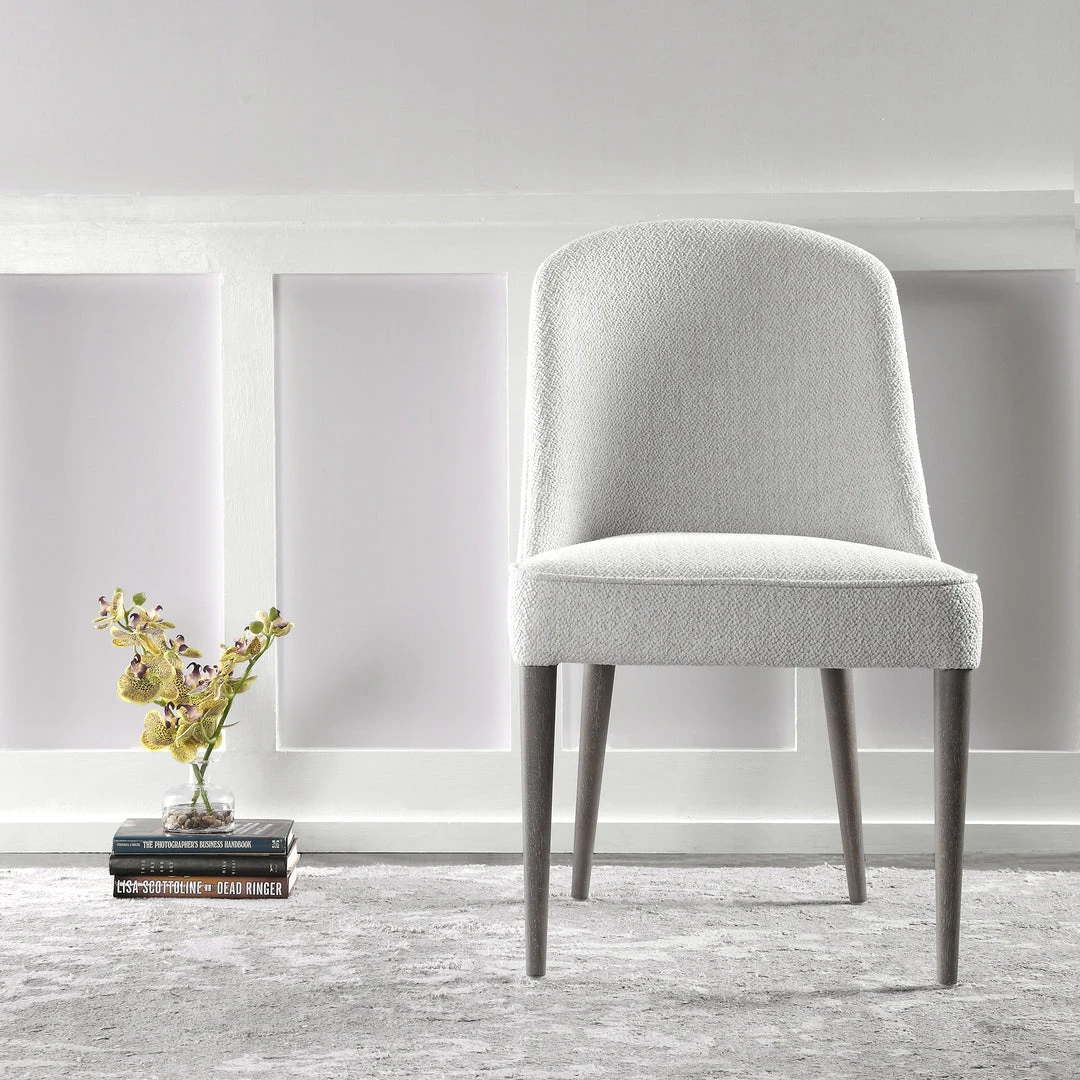 Perfect For Modern Dining, This Armless Chair Features A Casual Off-white Textured Fabric With Welted Trim And Solid Wood Legs Finished In Light Walnut. Sold As A Set Of 2. Seat Height Is 19″.
