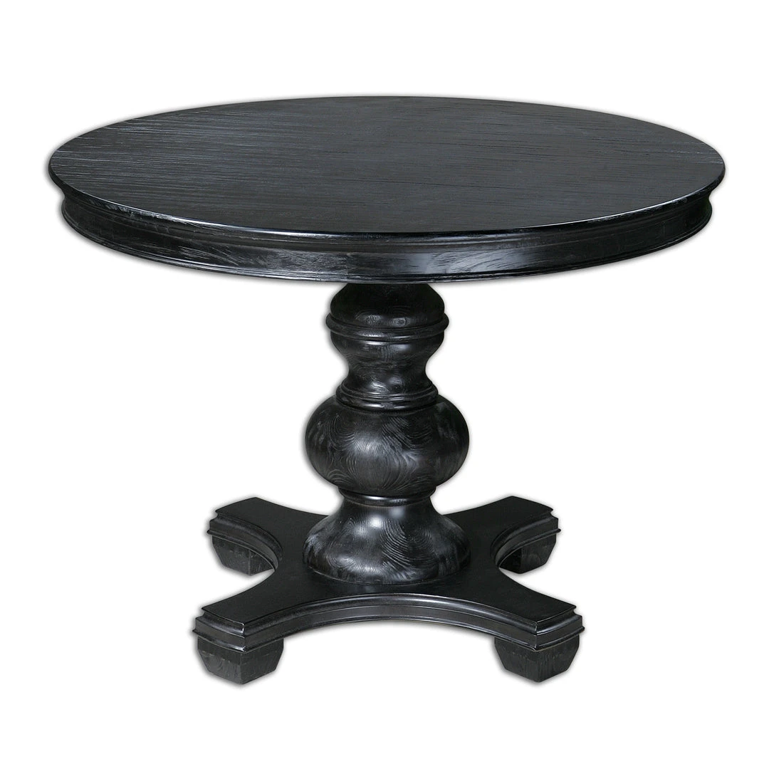 An Elegant Entryway Table Or Small Dining Table, Featuring Detailed Moldings And A Stylish Turned Baluster In A Satin Black Finish With Subtle Pine Wood Grain.