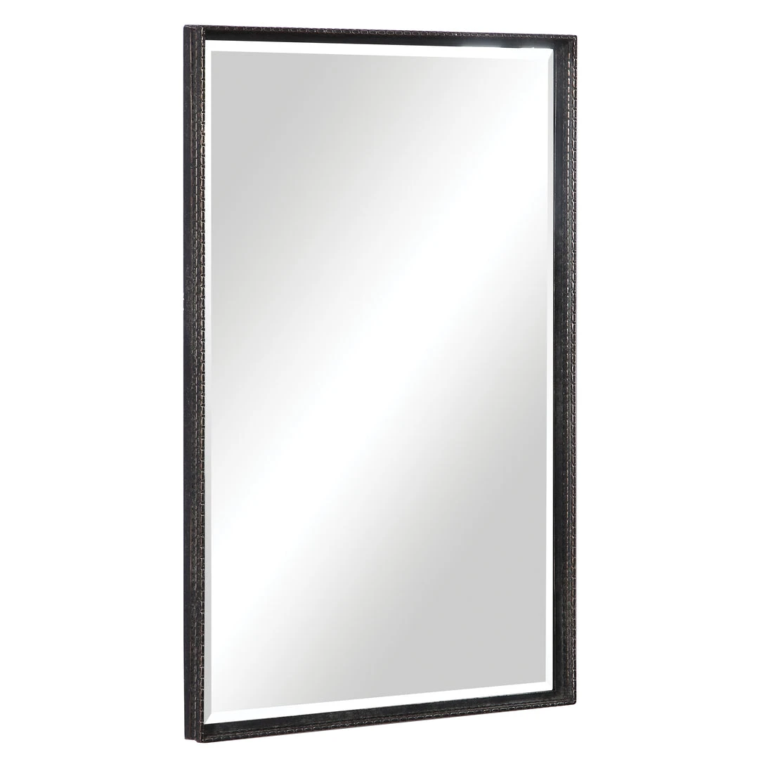 This Simple Vanity Mirror Features An Iron Construction With Detailed Edges. The Slight Profile Frame Is Finished In A Distressed Rustic Bronze With Aged Gold Highlights. This Mirror May Be Hung Horizontal Or Vertical.