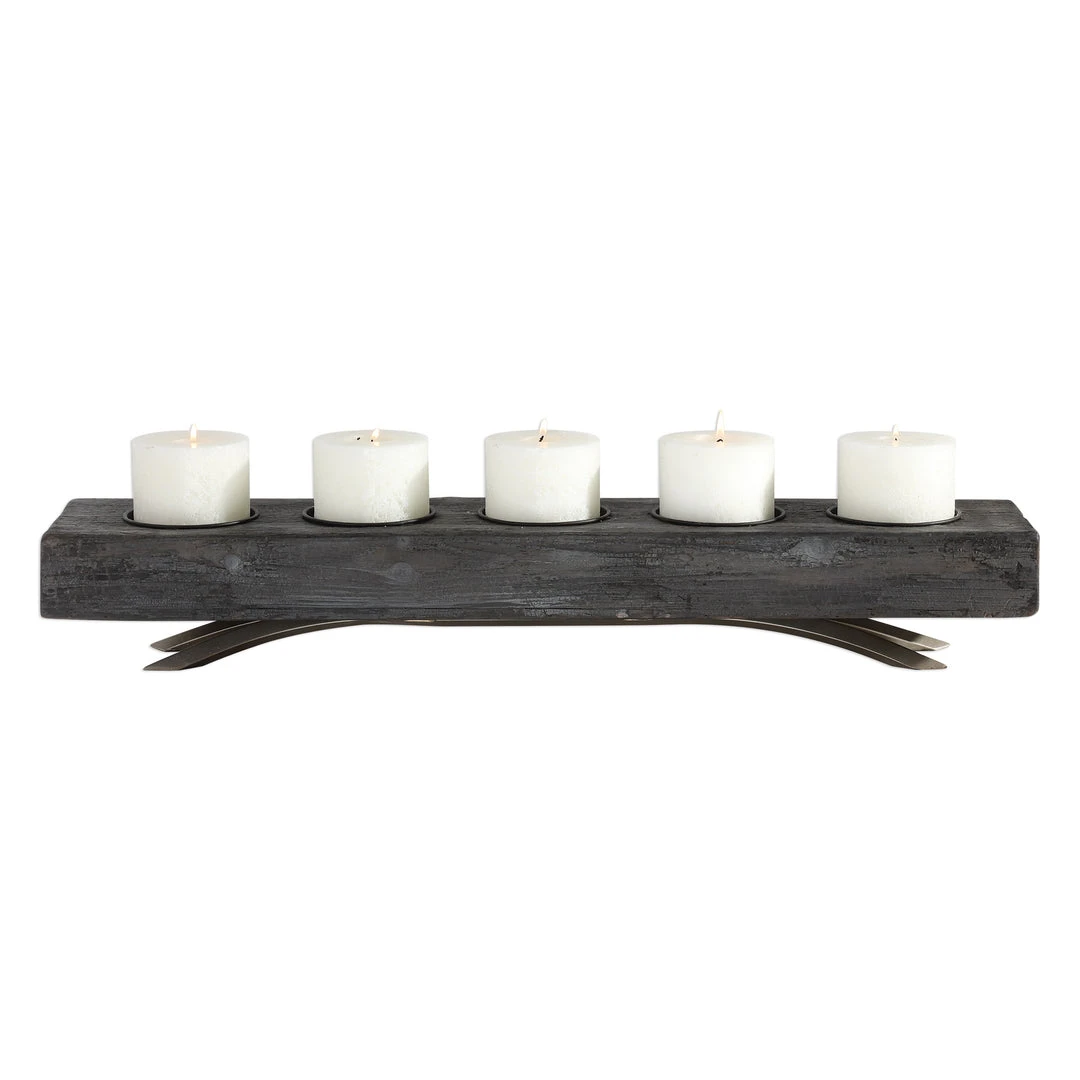 Crackled, Aged Black Wood With Recessed Candle Cups Set Atop Heavily Antiqued Silver, Arched Iron Legs, And Five 4″x 3″ Distressed White Candles.
