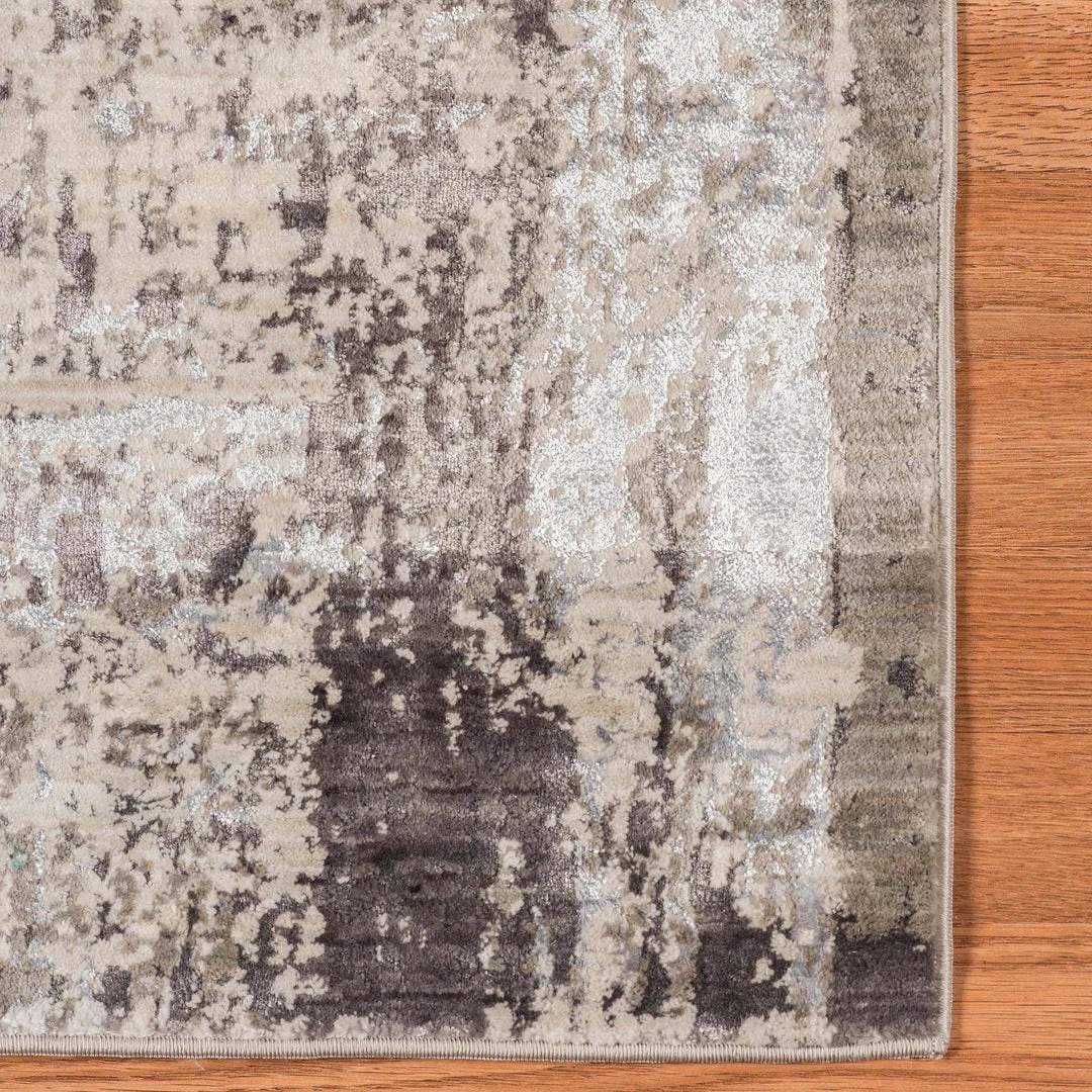 This power loomed rug features an abstract design in tones of polyester charcoal, ivory, light gray, and silver.