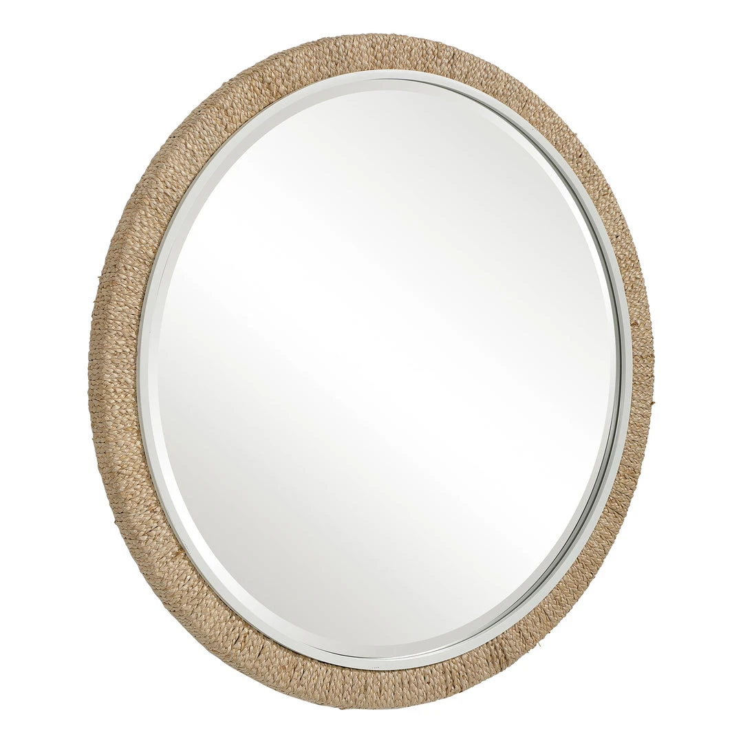 Influenced By Modern Coastal Style, This Round Mirror Has A Braided Banana Leaf And Matte White Frame Exuding A Light And Airy Feel. The Piece Is Accented By A Generous 1 1/4″ Bevel.