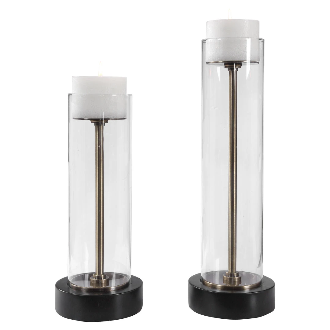 This Set Of Two Candleholders Feature An Aged Brass Stand Surrounded By A Clear Glass Hurricane And Finished With A Thick Bronze Foot. Two 4″x 3″ Distressed Off-white Candles Included. Sizes: S-7x16x7, L-7x20x7