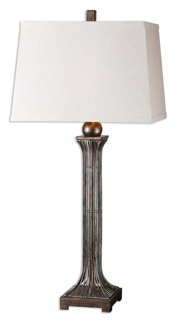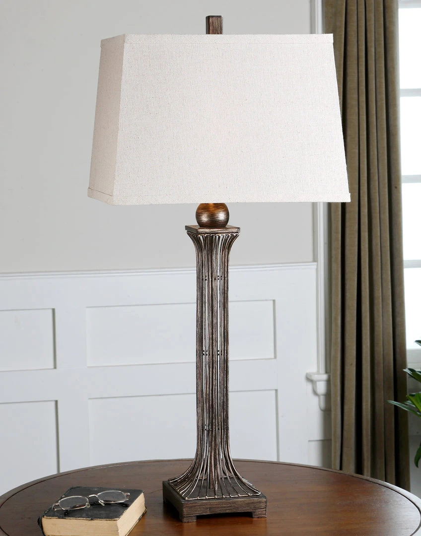 Heavily Distressed Dark Bronze Wash With Silver Undertones. The Rectangle Tapered Hardback Shade Is An Off-white Linen Fabric With Light Slubbing.