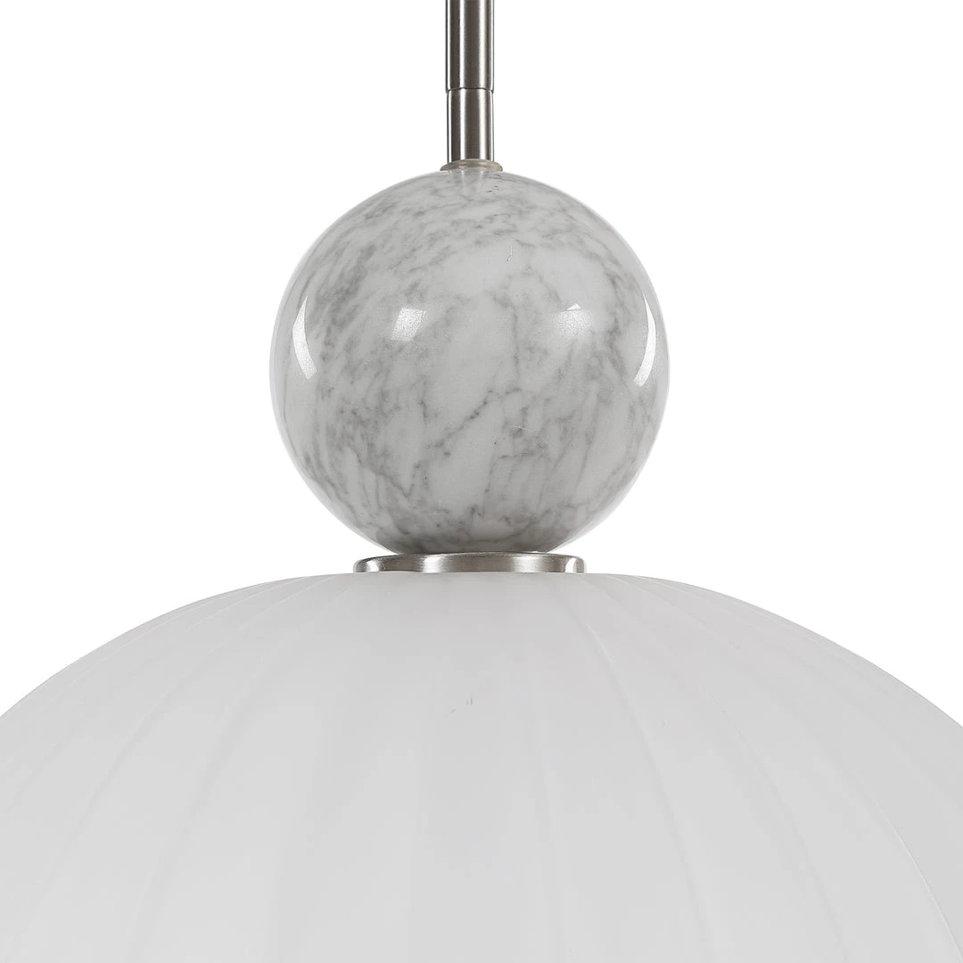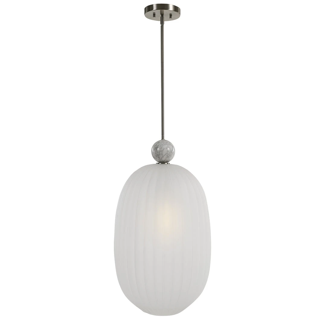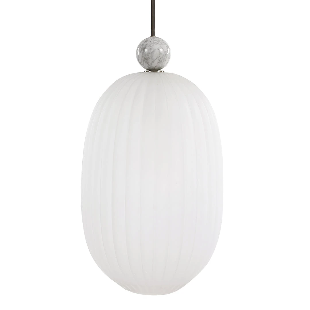 Grand Oversized Elongated 1 Lt. Pendant With A Generously Proportioned Etched Melon Glass Shade Featuring A Substantial White Marble Accent And A Refined Brushed Nickel Finish. With 1-100 Watt Max, Edison Socket And Includes 15 Wire, 3-12″ Stems And 1-6″ Stem For Adjustable Installation.