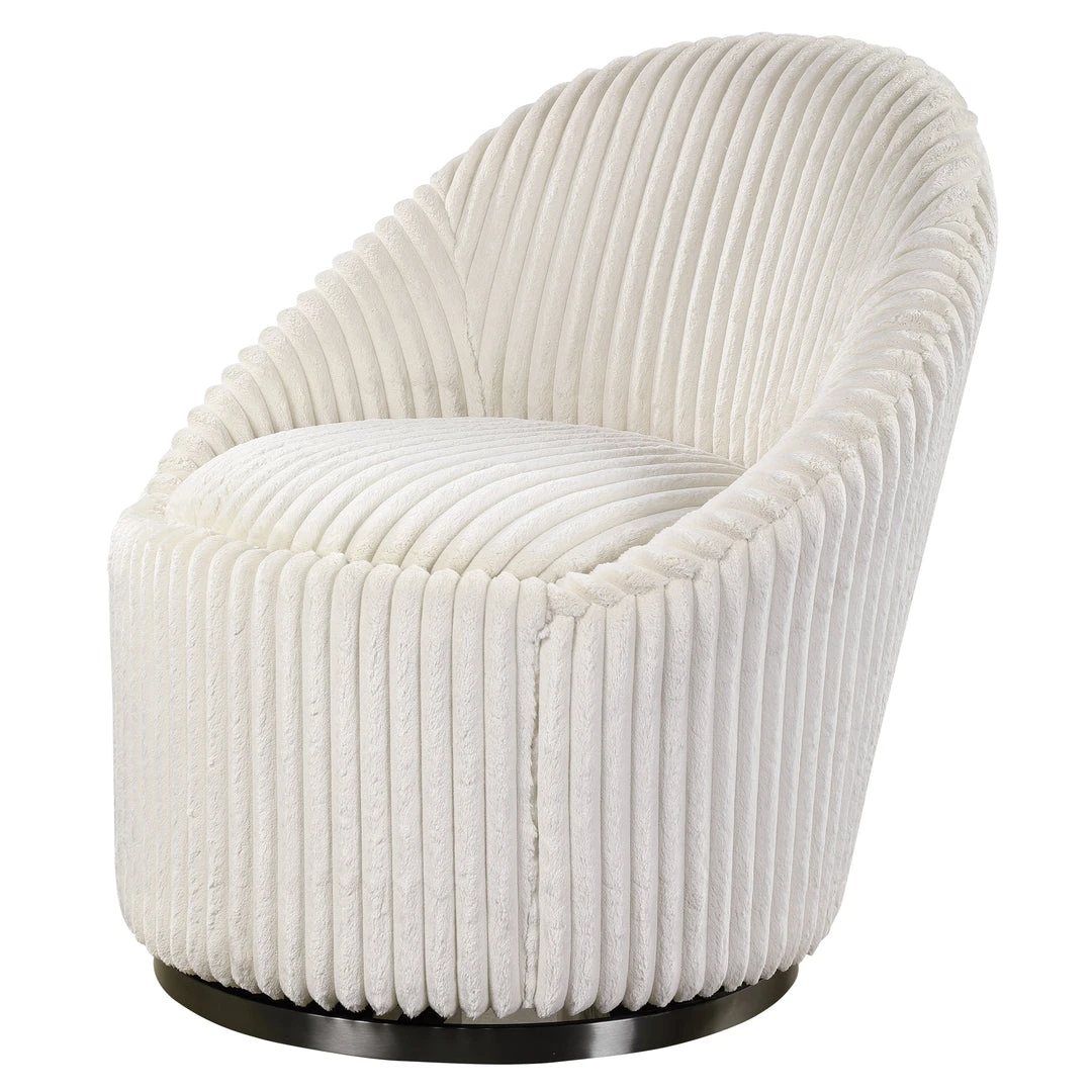A Blend Of Contemporary And Feminine Styles, This Chair Is Upholstered In A Luxurious Fluted Ivory Chenille Fabric And Is Accented By A Stainless Steel Swivel Base Finished In Brushed Black Nickel. Seat Height Is 19″.
