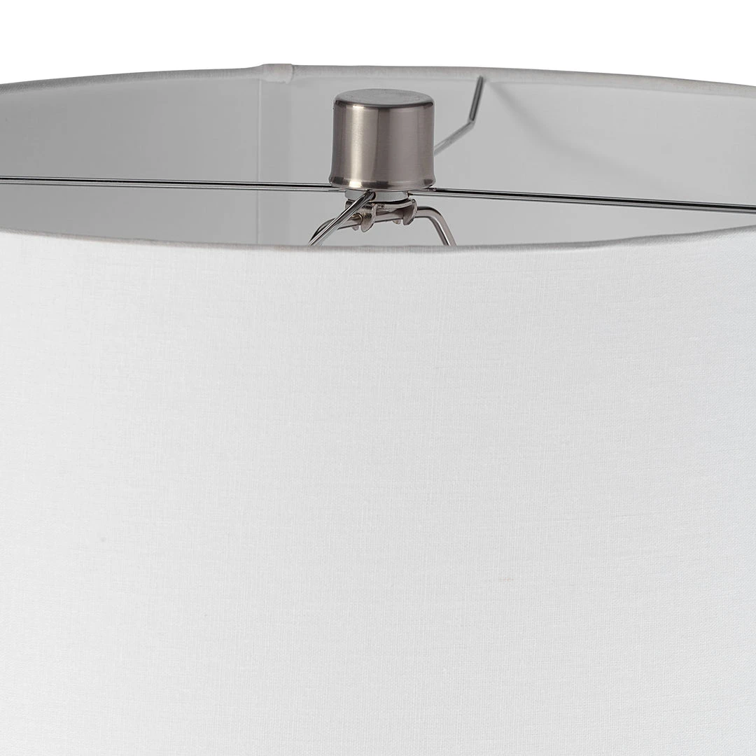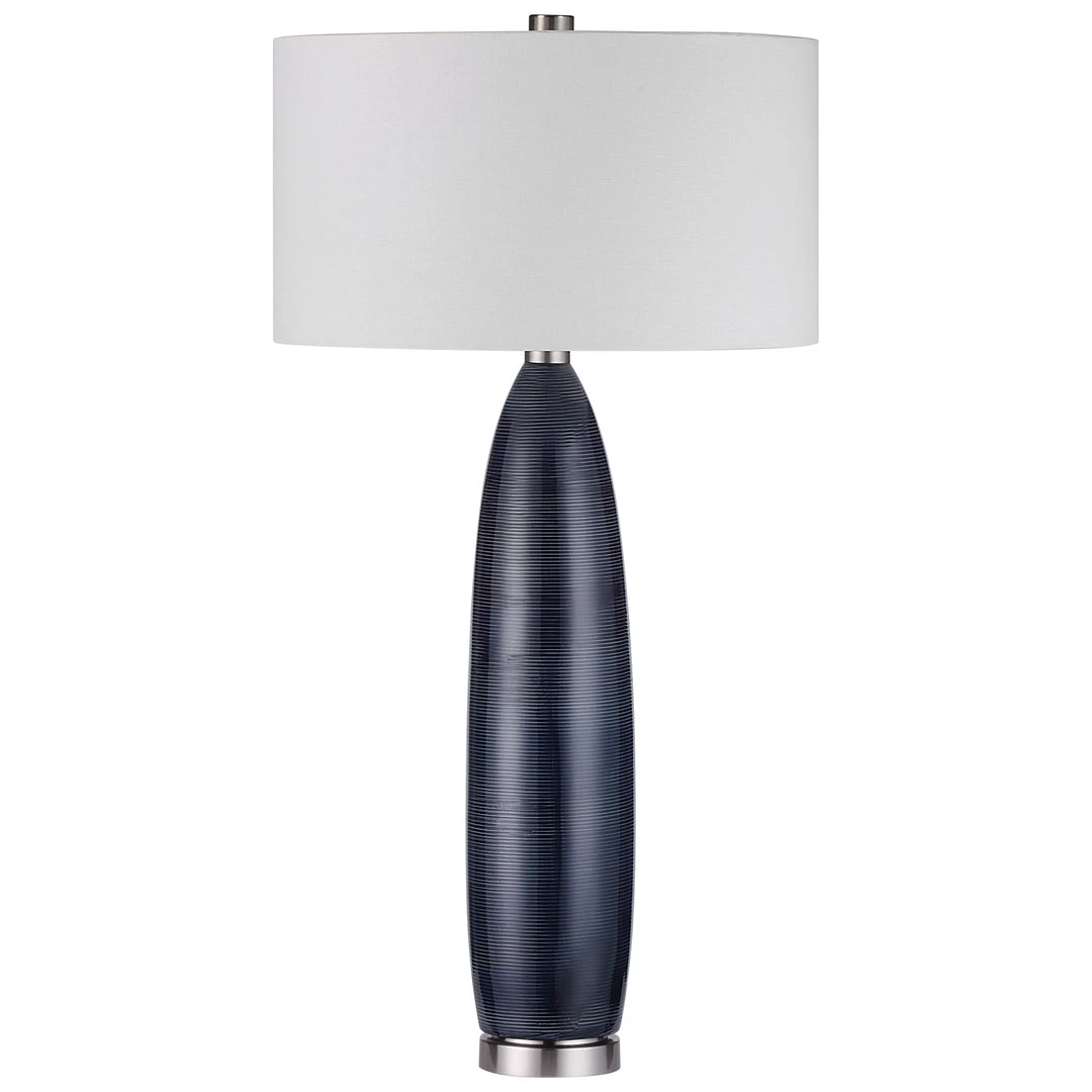 This Handcrafted Ceramic Table Lamp Showcases An Elevated Look With A Striped Motif And A Prussian Blue-gray Glaze. Brushed Nickel Plated Iron Details Accentuate The Design. The Hardback Drum Shade Is Covered In A White Linen Fabric.