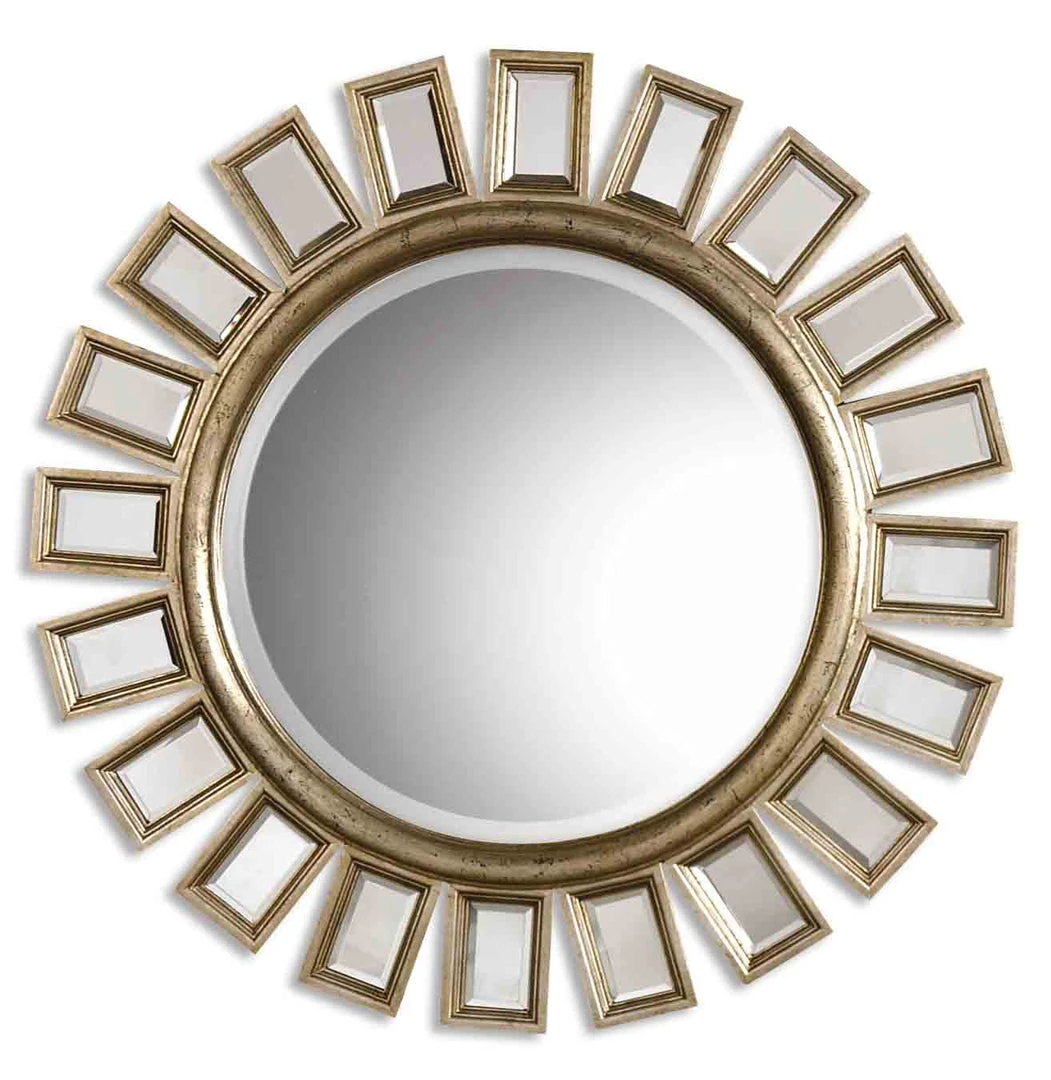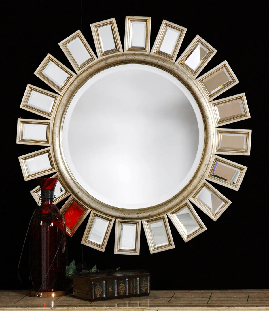 This Round, Beveled Mirror Has A Wood Frame And Is Accented By Several Individual Beveled Mirrors. The Frame Finish Is Distressed Silver Leaf With Light Antiquing Giving The Appearance Of Aged Champagne.