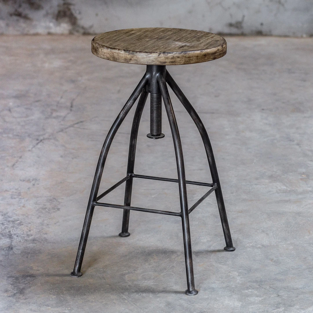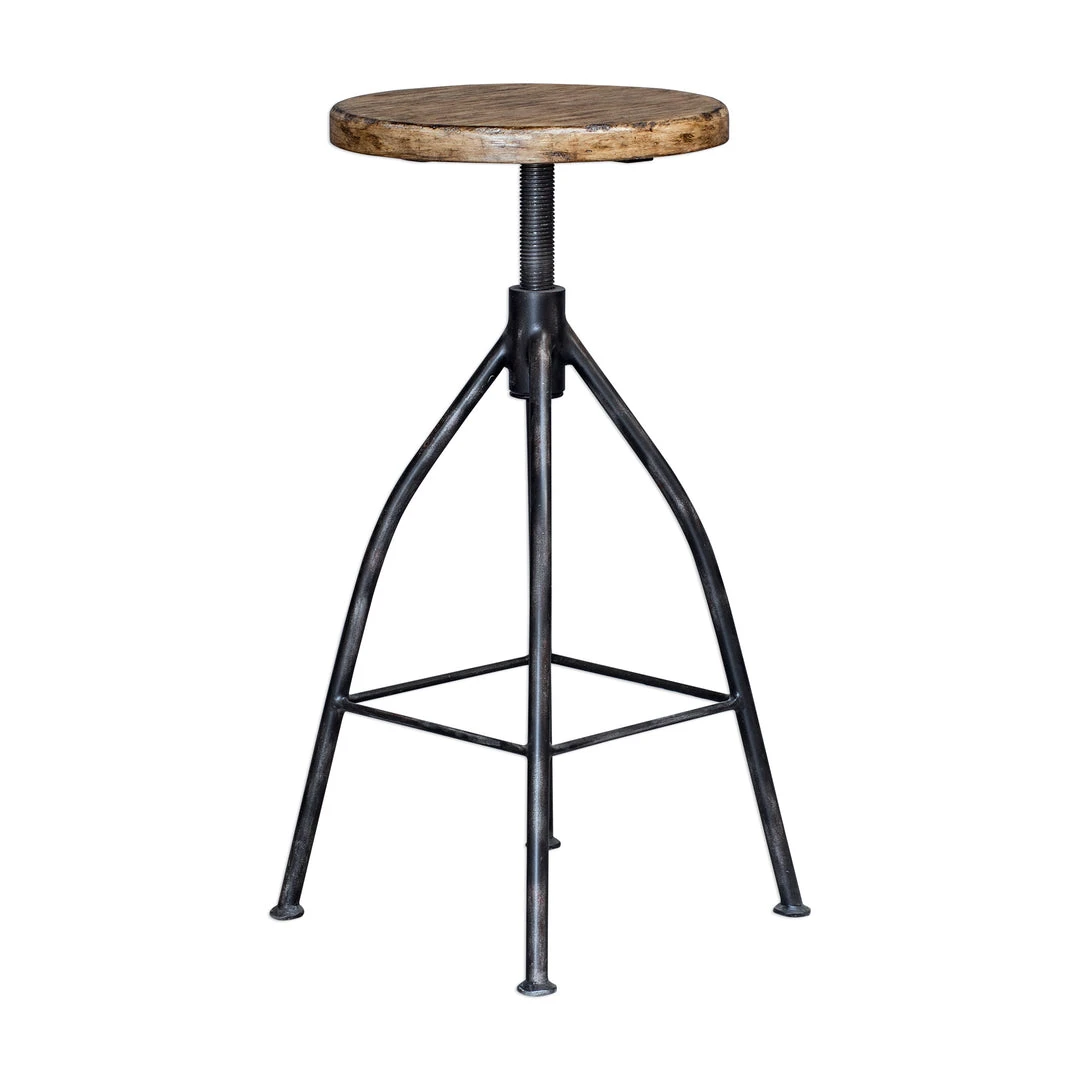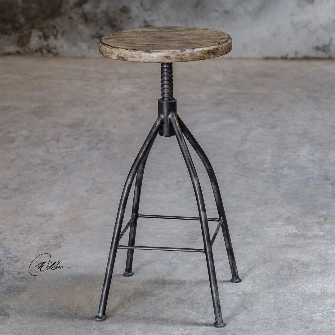 Add Industrial Style To A Space With This Pub Stool Design. The Hammered Metal Base Is Finished In Aged Steel And Is Topped With A Round, Mango Veneer Top In A Driftwood Finish. Stool Turns To Adjust From 25″ To 30″ Height.